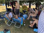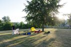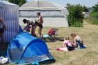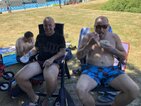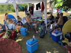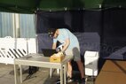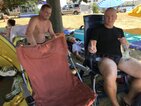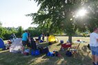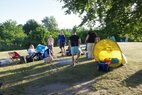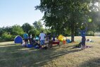 Und dann stand endlich der 30.06. vor der Tür. 6.00 Uhr holten wir die Startunterlagen ab und bauten unser „Lager“ auf der Wiese neben dem Becken auf. Dabei stellte uns Mirko H. seinen bewährten Pavillon zur Verfügung, welcher unter tatkräftiger Unterstützung von Rico herangeschleppt und aufgebaut wurde. Vor allem in der Mittagshitze sollte uns dieser wertvollen Schatten spenden.