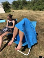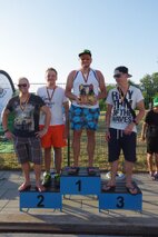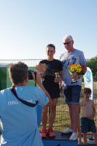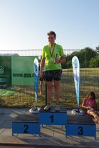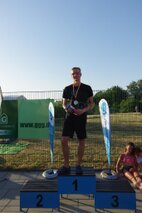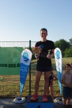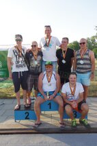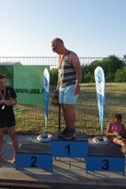 Zum Schlusspfiff 19.00 Uhr hatten wir es alle ziemlich satt. Die Sonne schien noch immer erbarmungslos und das Einräumen der Taschen und Zelte war grauenhaft. Müde schleppten wir uns 19.30 Uhr zur Siegerehrung. Da bis auf eine Ausnahme von den Einzelstartern und den Teamwertungen keinerlei Zwischenergebnisse bekannt gegeben worden sind, waren wir noch ziemlich ahnungslos. Was dann folgte, verlieh allen ganz schnell wieder Kraft. JEDER der 17 Schwimmerinnen und Schwimmer hatte in seiner Altersklasse eine Medaille erkämpft! Zusätzlich gewannen in der Gesamtwertung unser „CSGH-Mädels“- Team den ersten Platz mit 144,7 km und die „CSGH-Männer“ mit 133,00 km den zweiten Platz. Ellen durfte sich noch über den Pokal für die meisten geschwommenen Kilometer bei den Frauen freuen. Jeder von uns hatte also 20.30 Uhr zwei Medaillen um den Hals. ;-)