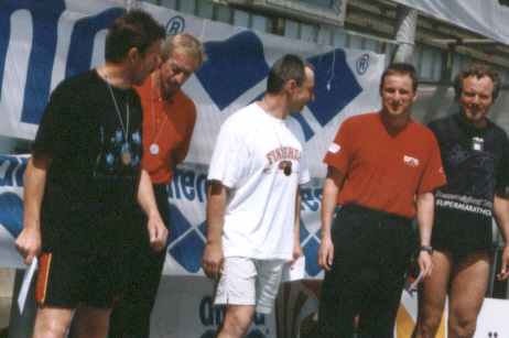 Andreas hatte in dieser Zeit sein Ziel von 33,8 km (100 m mehr als letztes Jahr) weit übertroffen und 35,1 km am Ende auf der Urkunde stehen. Zur Siegerehrung schien versöhnlich die Sonne und so glänzten die Silbermedaillen und Freudentränen an unseren sechs Schwimmern des Teams „CSGH und Mäx“ besonders. Andreas erreichte den 4. Platz und für Ellen, die eigentlich zum Lehrgang mußte und nur abends mal 5 km geschwommen war, gab es noch eine Bronzemedaille.