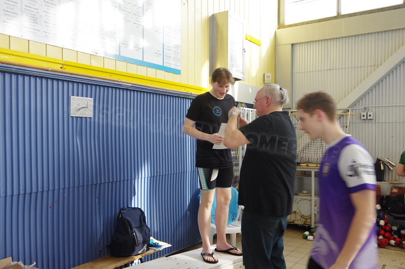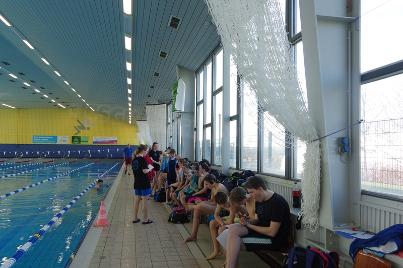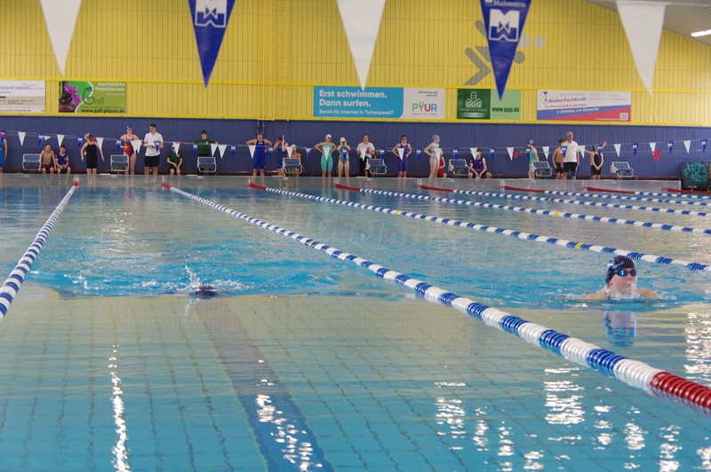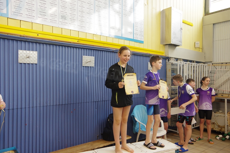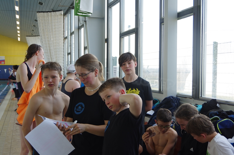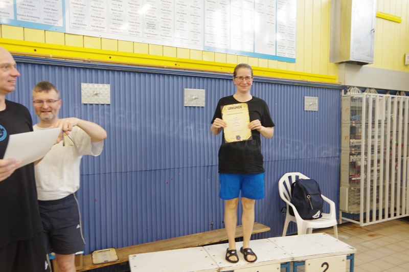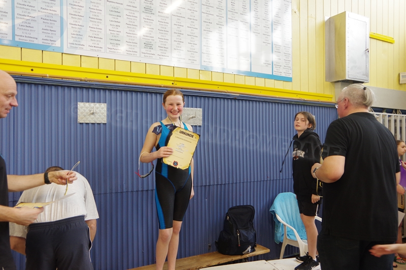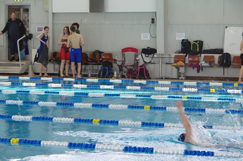Bevor wir 16.00 Uhr mit dem zweiten Abschnitt begannen, gab es die Siegerehrung für den 1. Teil. Im 2. Abschnitt wurden 50 m Brust, 100 m Rücken, 50 m Freistil und 100 m Brust geschwommen. Während die Jungs hinter der Technik fleißig die Ergebnisse ausrechneten, kämpften jeweils 6 Teilnehmer pro Verein in der Gaudistaffel um gute Platzierungen und eine kleine Tüte voller Süßigkeiten. Ganz zum Schluss konnten wir noch die Siegerehrung für den zweiten Abschnitt machen und waren 18.00 Uhr mit dem Wettkampf fertig.