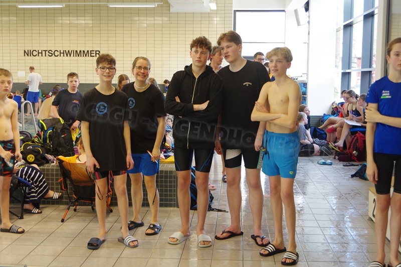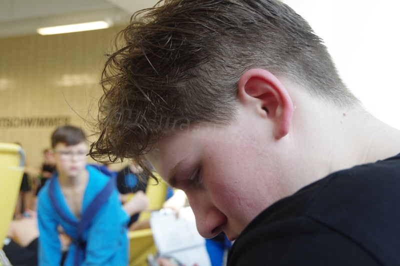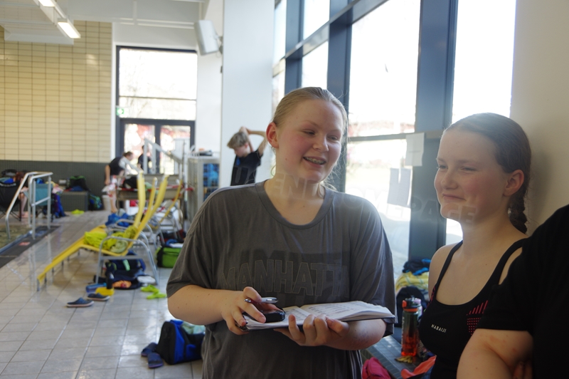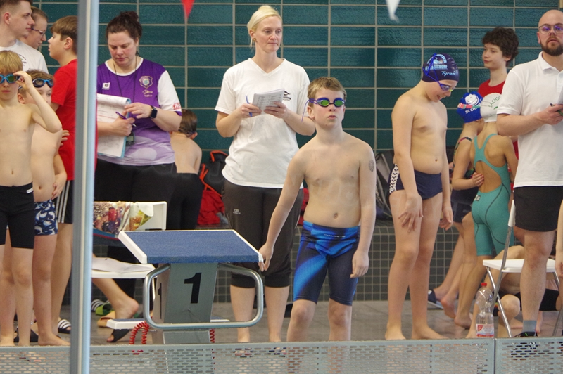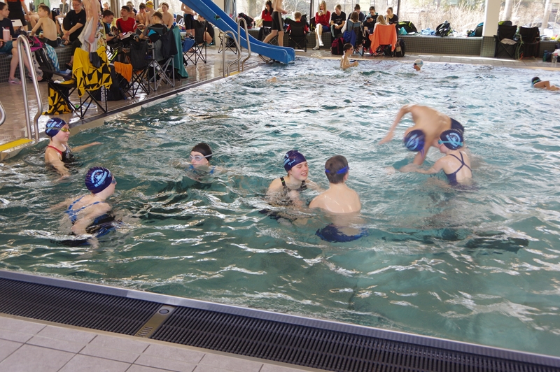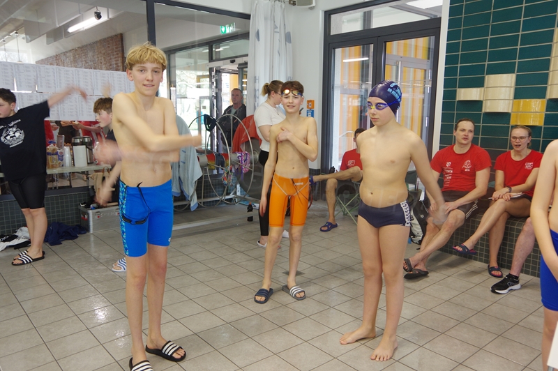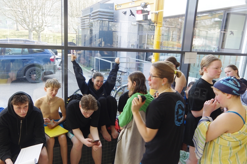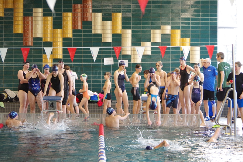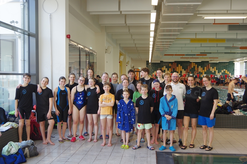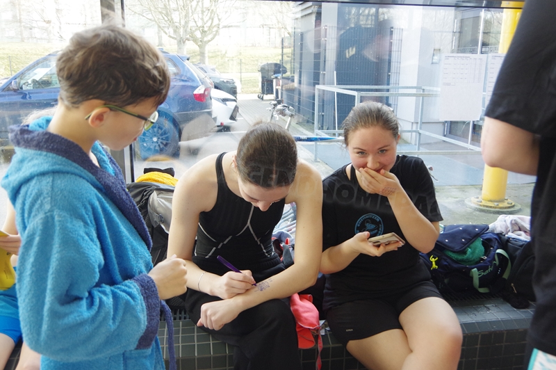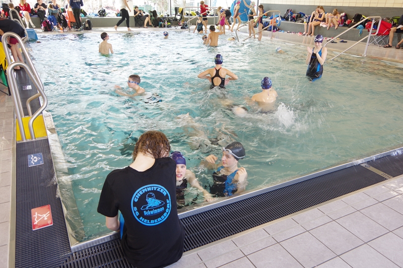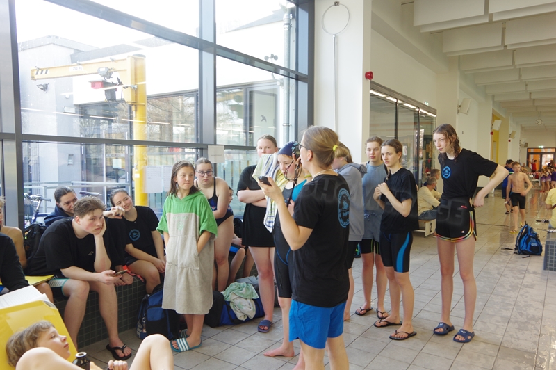 Wir trafen uns 08.50 Uhr vor der Halle, um pünktlich zum Einlass „die Halle zu stürmen“ und uns einen guten Platz zu sichern. Schon das Einschwimmen war für alle eine Herausforderung. Es gelang uns für 20 min eine Bahn zu „reservieren“ und nochmal die wichtigsten Wenden und Starts zu üben. Nachdem jeder von uns 4-6 Sprints absolviert hatte, verließen wir das übervolle Becken, zogen uns um und warteten auf den Wettkampfbeginn.