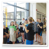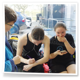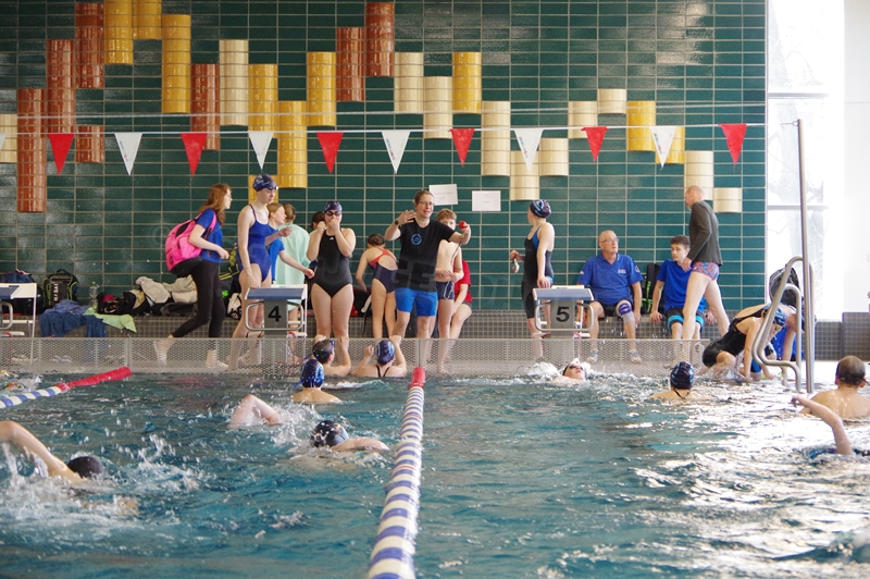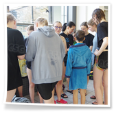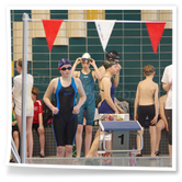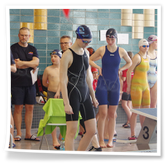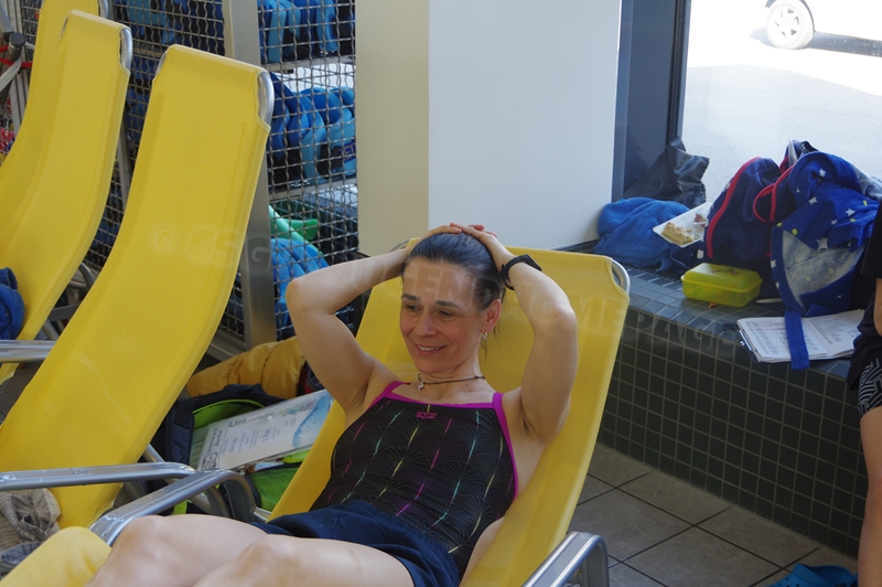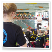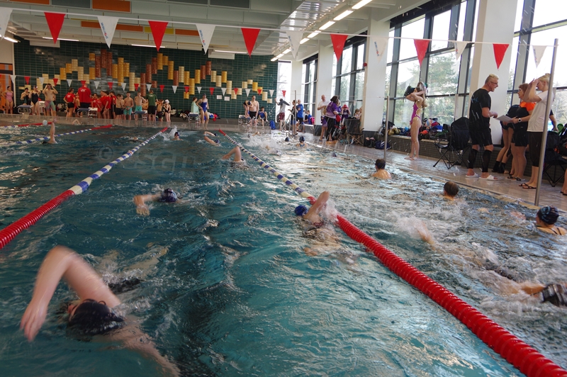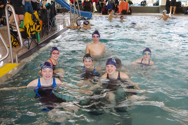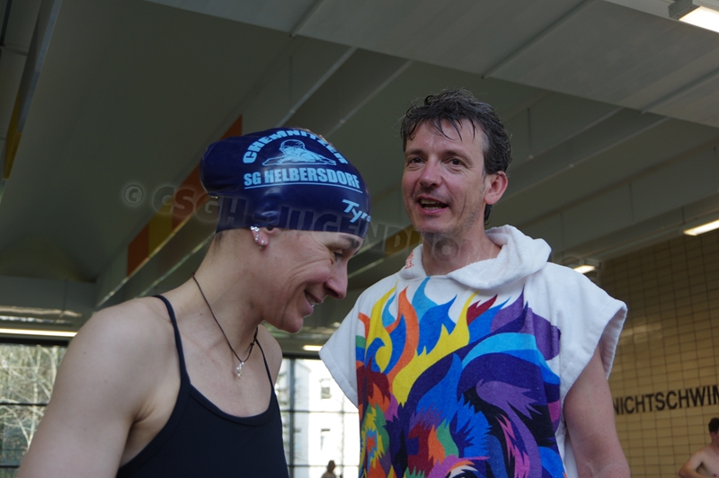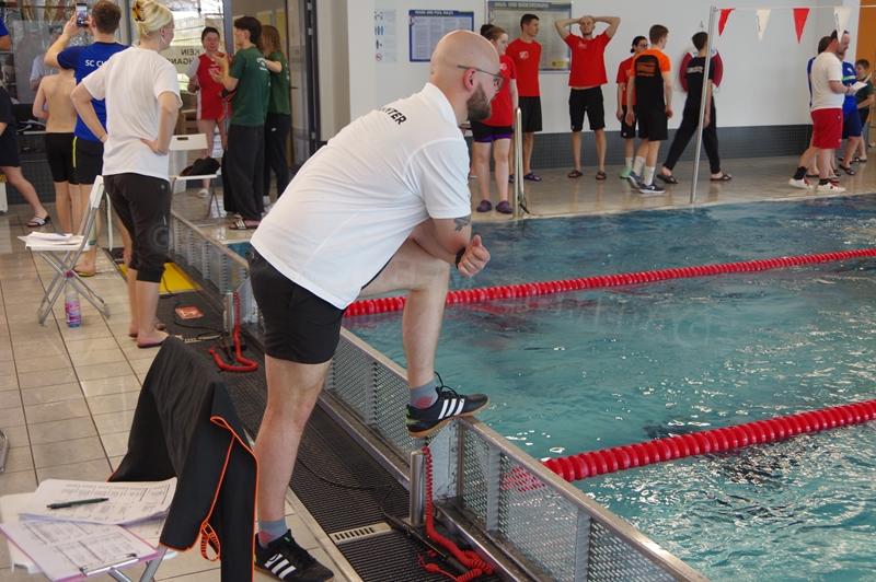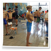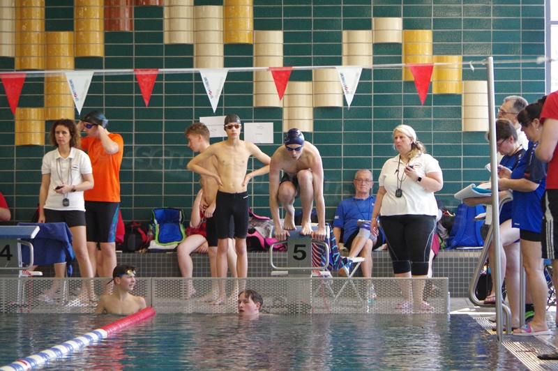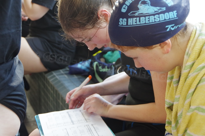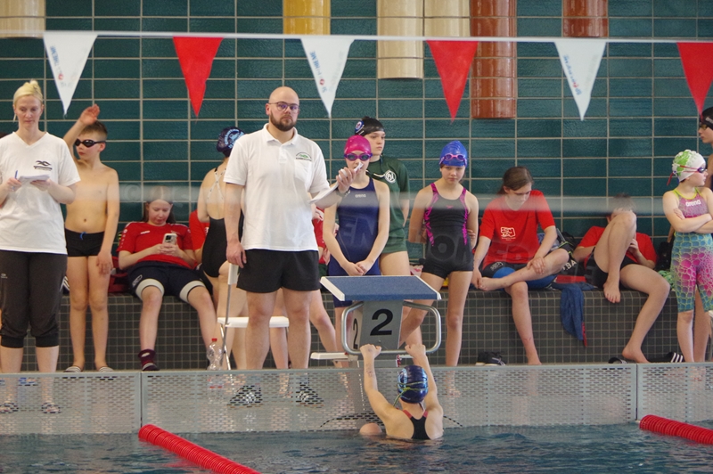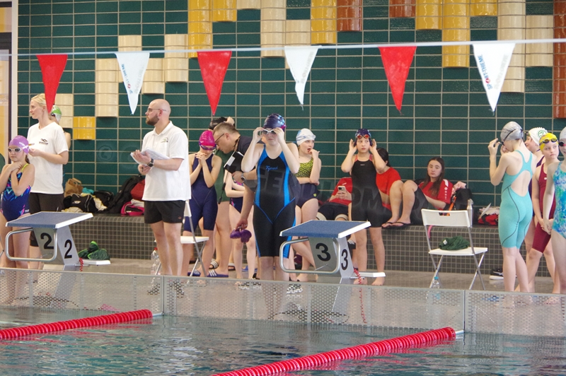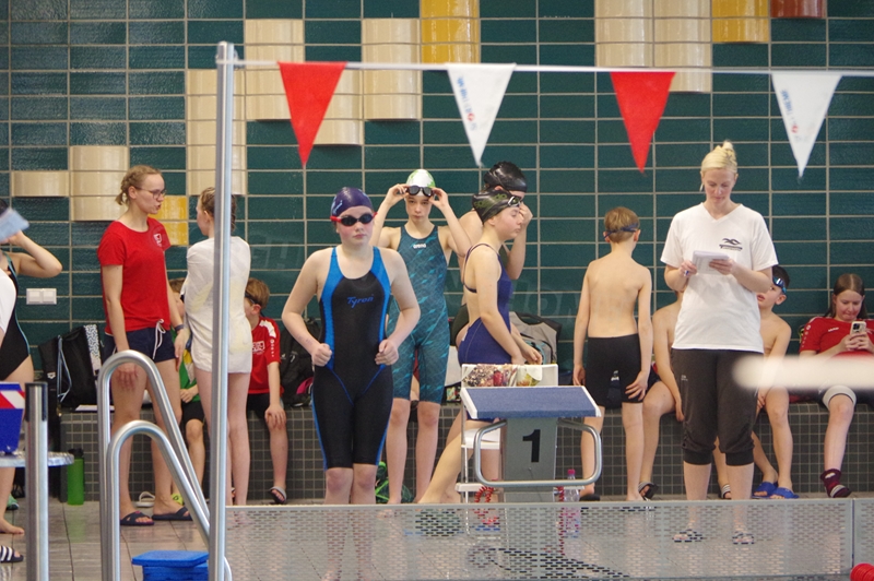 Wir trafen uns 08.50 Uhr vor der Halle, um pünktlich zum Einlass „die Halle zu stürmen“ und uns einen guten Platz zu sichern. Schon das Einschwimmen war für alle eine Herausforderung. Es gelang uns für 20 min eine Bahn zu „reservieren“ und nochmal die wichtigsten Wenden und Starts zu üben. Nachdem jeder von uns 4-6 Sprints absolviert hatte, verließen wir das übervolle Becken, zogen uns um und warteten auf den Wettkampfbeginn.