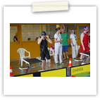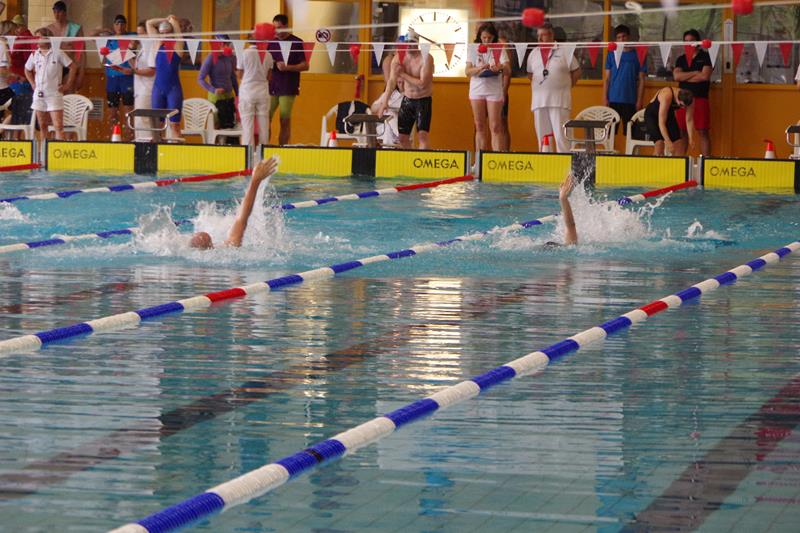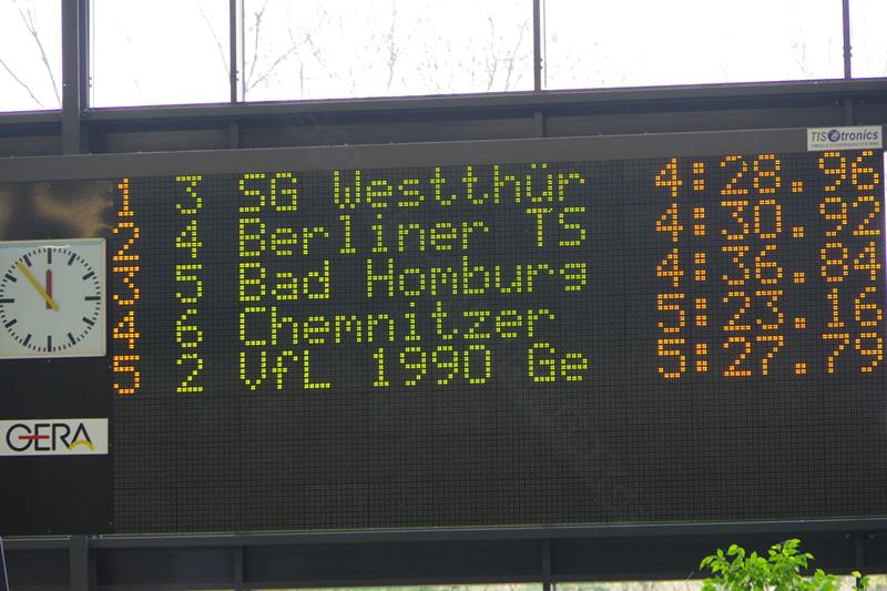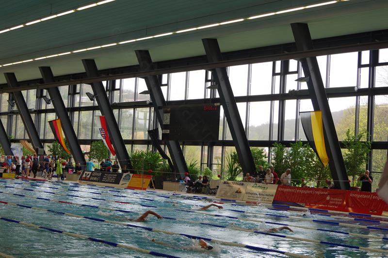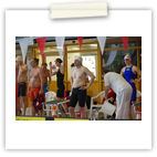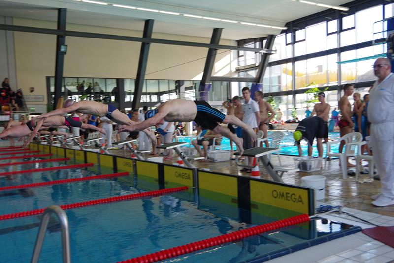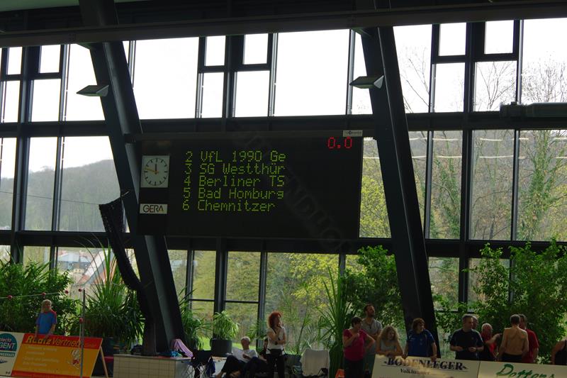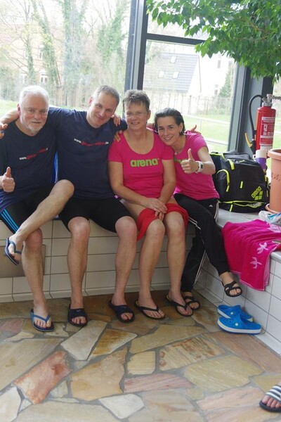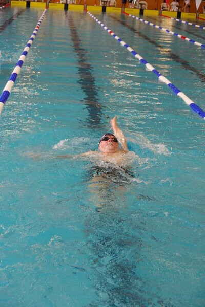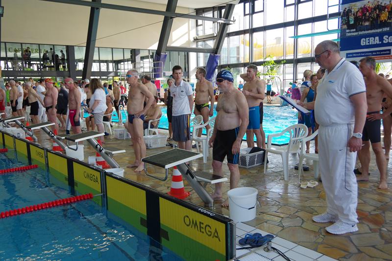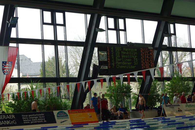 Am Samstag starteten wir nach dem Frühstück pünktlich 8.00 Uhr in die Halle. Dort wartete bereits Andreas mit Peggy auf uns, die dieses Jahr leider nicht mit übernachten konnte. Kurz vor Ende des Einschwimmens half Gerlind mal noch eben fix bei der Rettung eines Herzinfarktes und dann ging es endlich los! Unsere Starts waren ähnlich derer im letzten Jahr. Zuerst war Heinz über 200m Lagen dran. Dann schwammen Ellen und Andreas die 100 m Rücken. Zum Ende des ersten Abschnittes kam die 4x50m Lagen-Staffel. Nach der Pause flog Gerlind bei 100m Brust durchs Wasser. Als Letzter an diesem Tag ging noch einmal Heinz über 50m Delphin an den Start. 18.00 Uhr verließen wir glücklich und geschafft die Halle direkt in Richtung der Gera-Arkaden zum Shoppen ;-) und anschließend stärkten wir uns in der Kneipe bei einem leckeren Abendessen. Den Rest des Abends quatschten wir wieder auf unserem Zimmer und freuten uns auf den nächsten Tag.