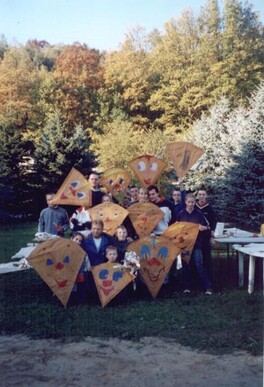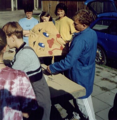 Zum Drachenfest auf dem Spielplatz in der Alten Harth trafen sich am 22.10.00 9 Kinder und 10 Jugendliche. Unter der Anleitung von Karsten und Simone bastelten und bemalten wir lustige Drachen: