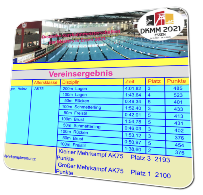 Und Heiz war nicht nur dabei. Er ist bei den Deutschen Meisterschaften der Masters in Essen den kompletten kleinen und großen Mehrkampf geschwommen und hat dabei auch ordentlich abgeräumt! Hier die Bilder: