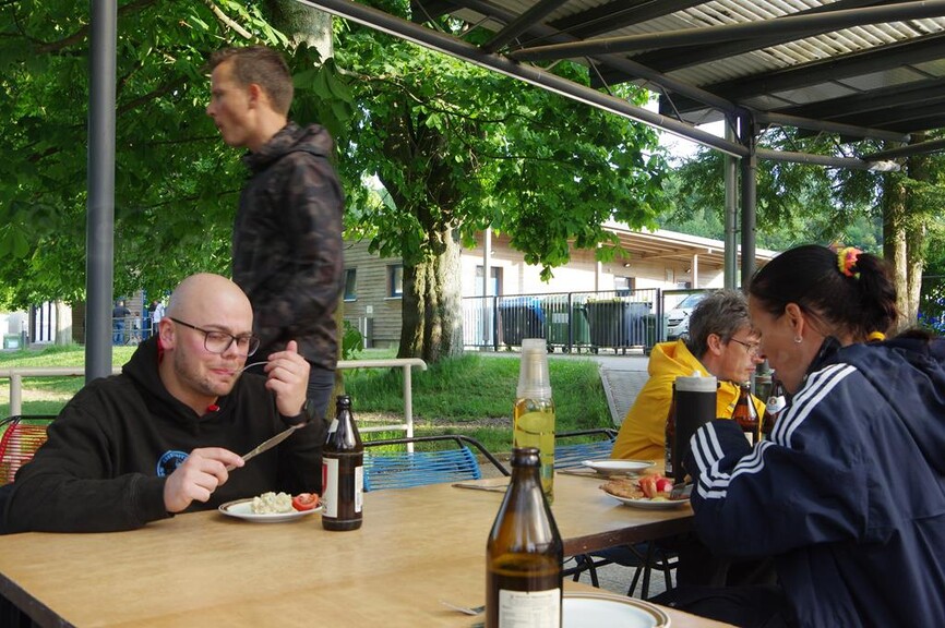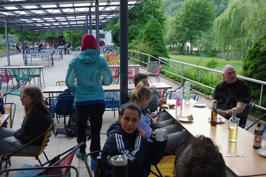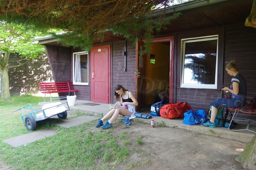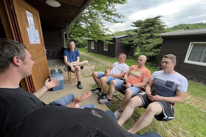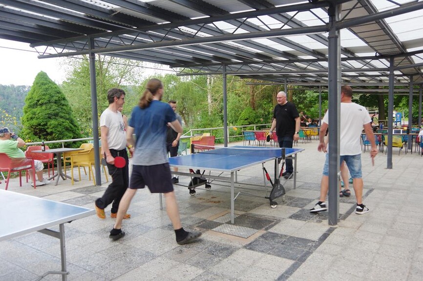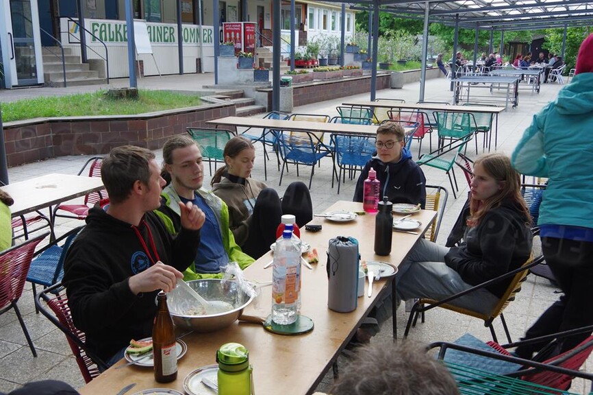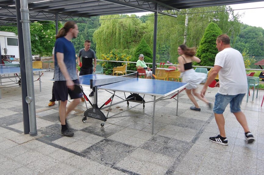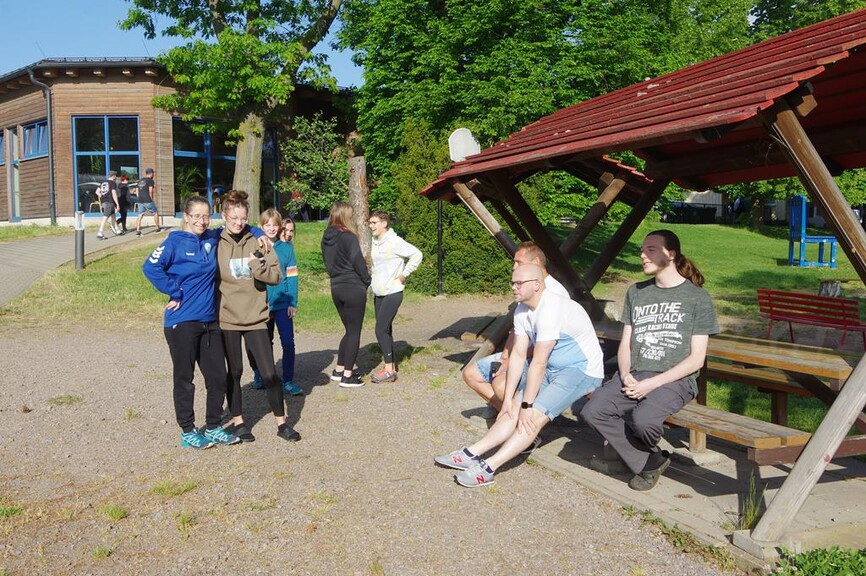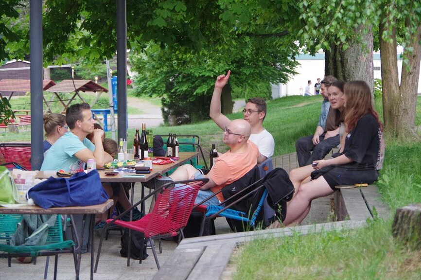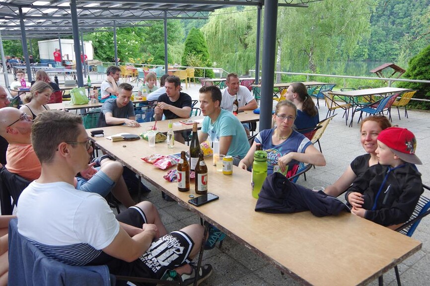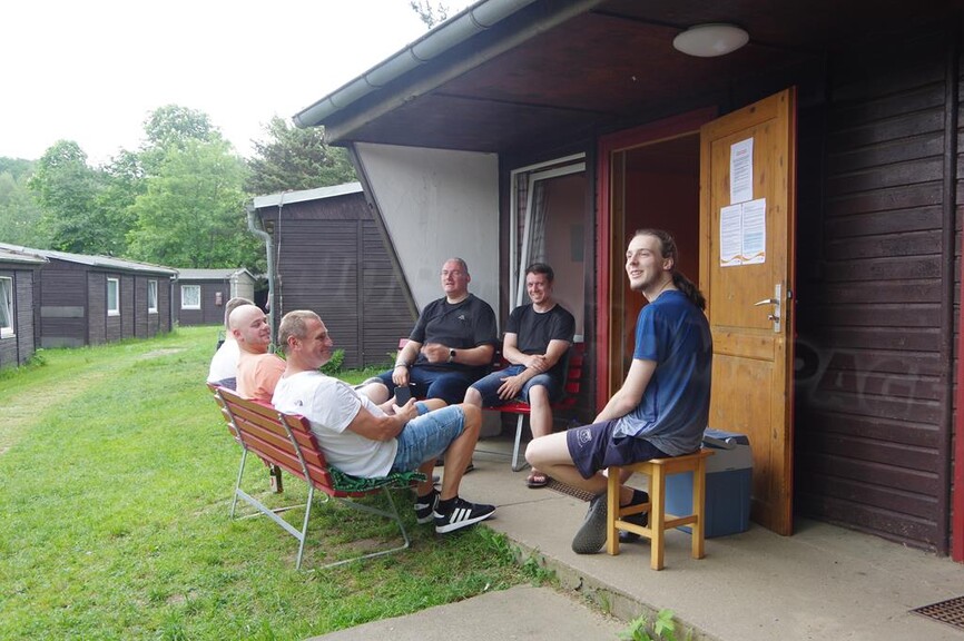 Am Freitag, den 20.05.22 bezogen wir mit 19 Schwimmern 7 Bungalows in der JH Falkenhain an der Talsperre Kriebstein. Das Wetter war schwühl heiß und so saßen wir, so bewegungsarm wie möglich, vor unseren Hütten, quatschten und hießen alle Ankommenden Willkommen. 18.30 Uhr waren alle da und wir gingen zum Abendessen (Nudeln mit Gulasch und Salate). Den restlichen Abend verbrachten wir mit Tischtennis, Karten spielen, in Gespräche vertieft oder mit Lernen unter der überdachten Terrasse, denn das Gewitter war inzwischen über uns hereingebrochen und es regnete, blitzte und stürmte.