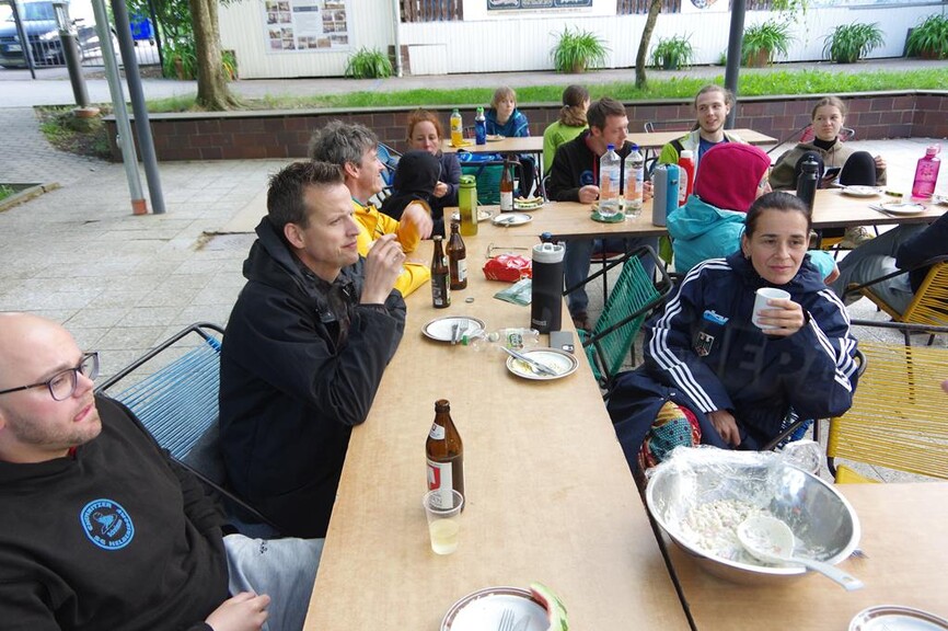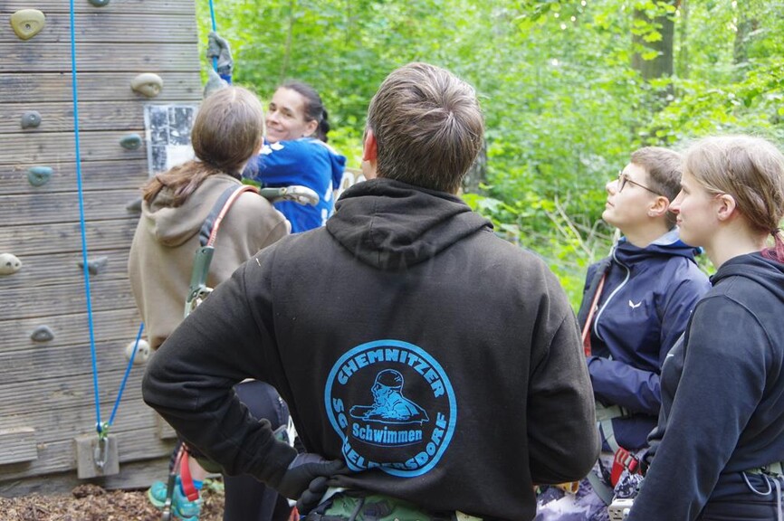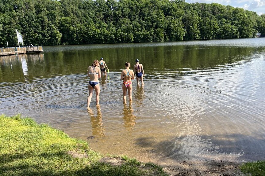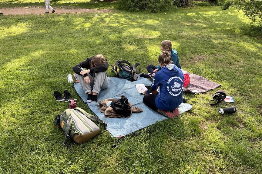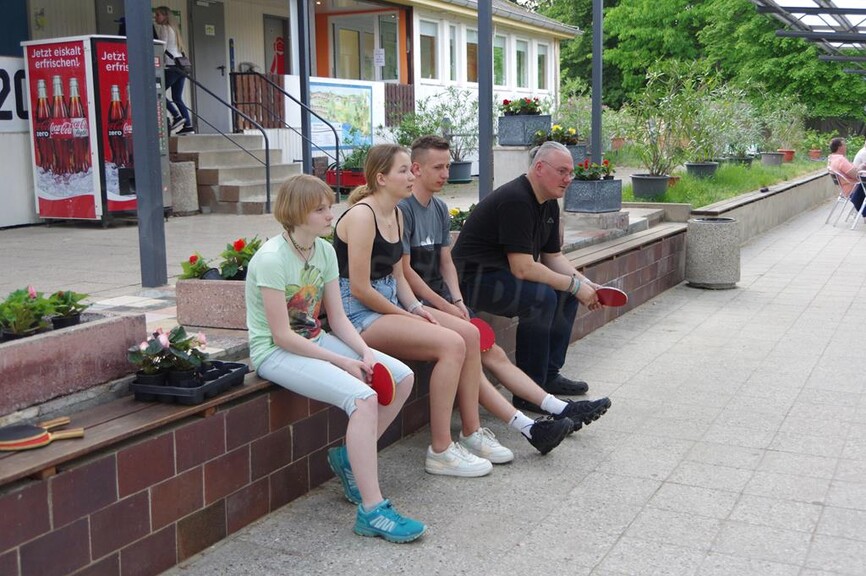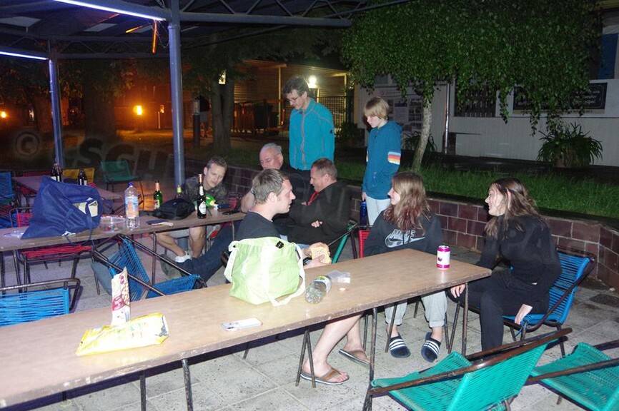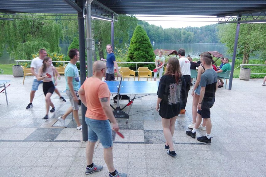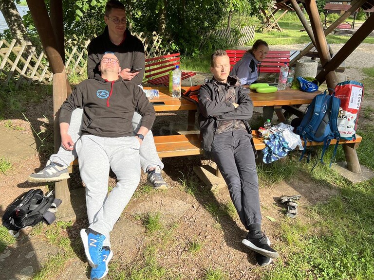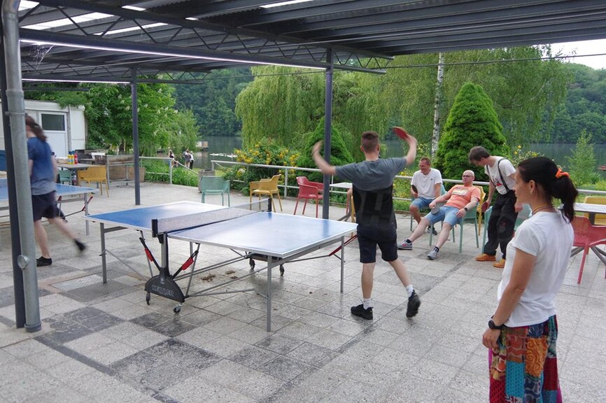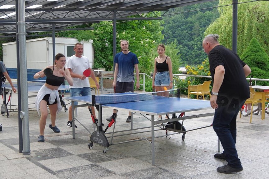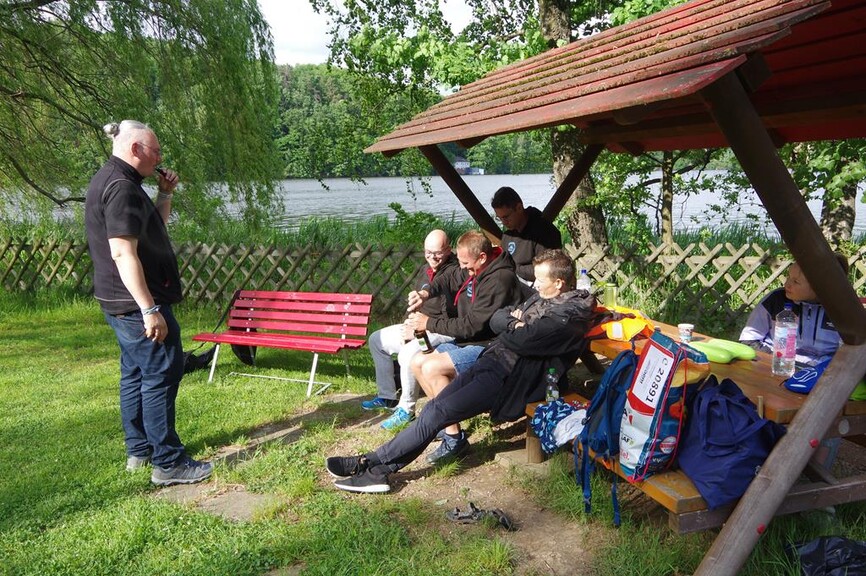 Am Freitag, den 20.05.22 bezogen wir mit 19 Schwimmern 7 Bungalows in der JH Falkenhain an der Talsperre Kriebstein. Das Wetter war schwühl heiß und so saßen wir, so bewegungsarm wie möglich, vor unseren Hütten, quatschten und hießen alle Ankommenden Willkommen. 18.30 Uhr waren alle da und wir gingen zum Abendessen (Nudeln mit Gulasch und Salate). Den restlichen Abend verbrachten wir mit Tischtennis, Karten spielen, in Gespräche vertieft oder mit Lernen unter der überdachten Terrasse, denn das Gewitter war inzwischen über uns hereingebrochen und es regnete, blitzte und stürmte.