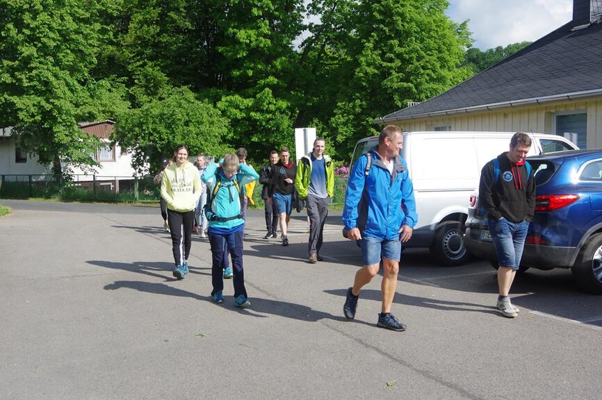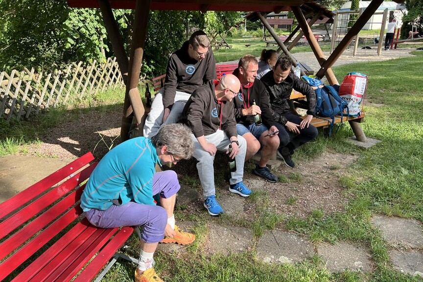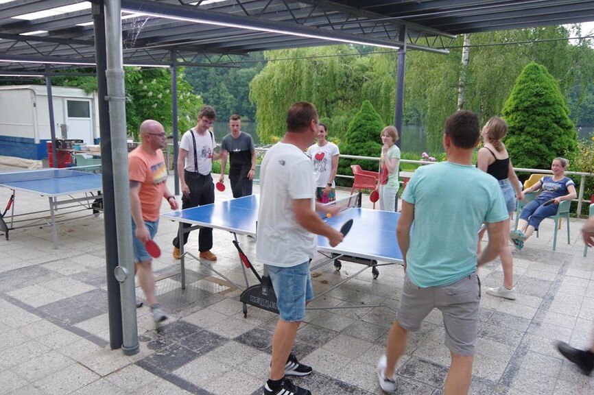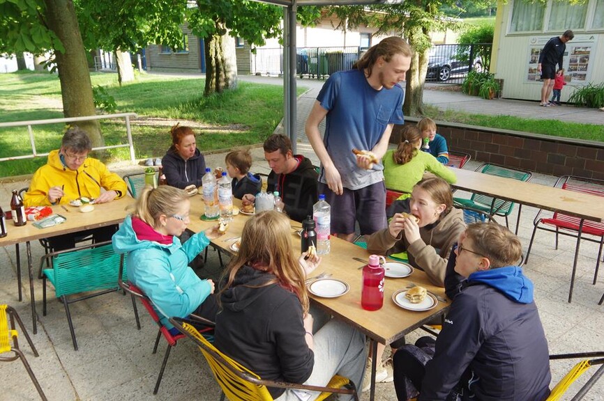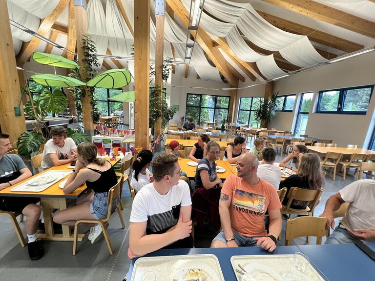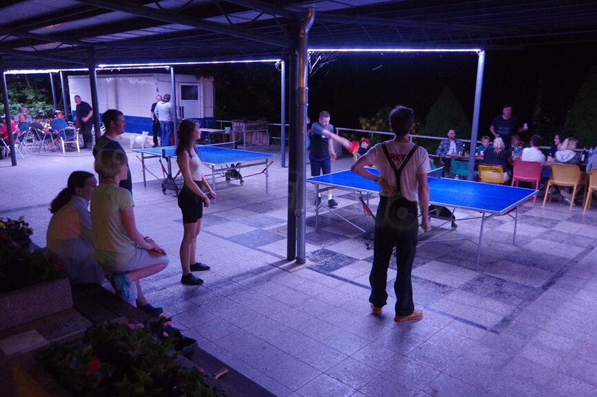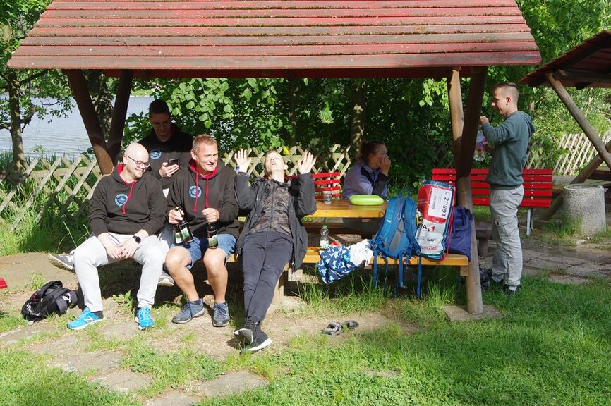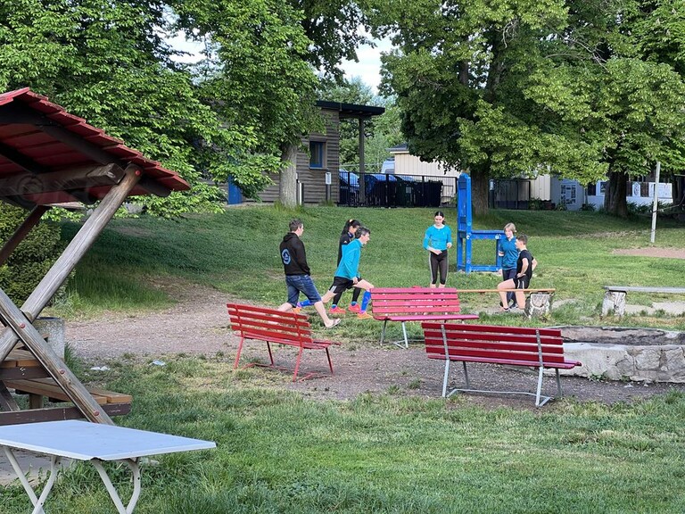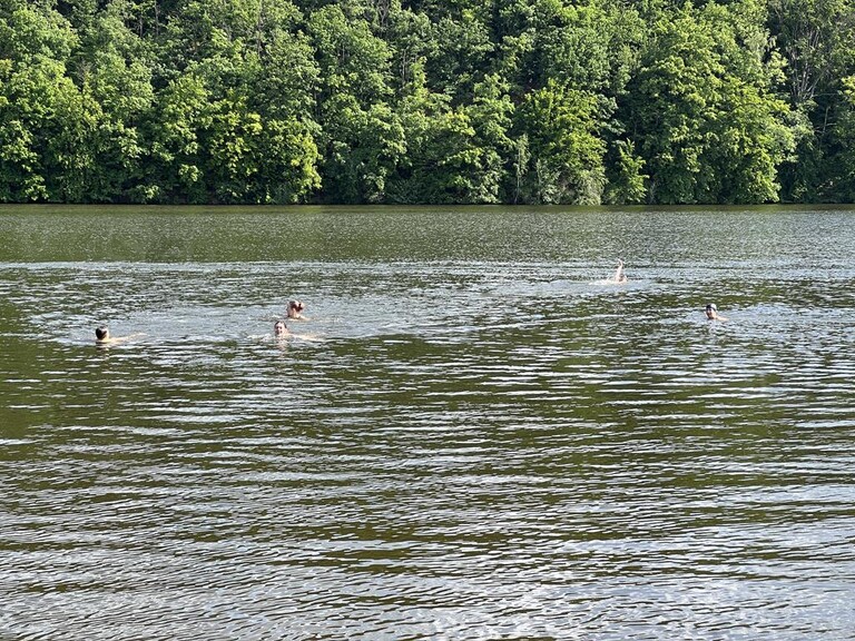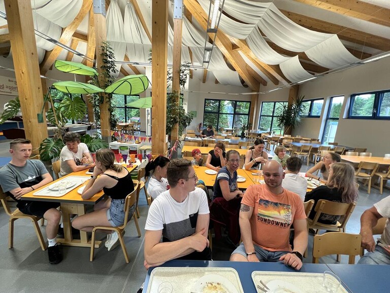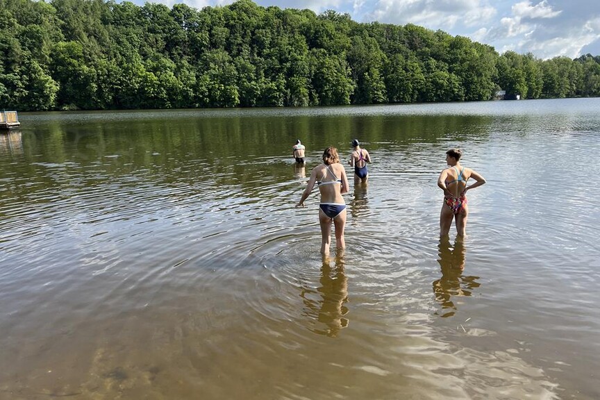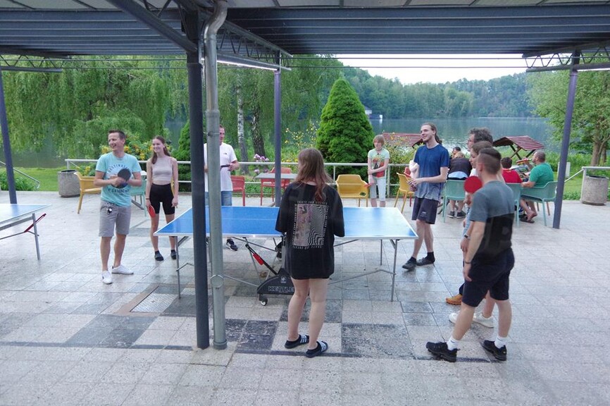 Am Freitag, den 20.05.22 bezogen wir mit 19 Schwimmern 7 Bungalows in der JH Falkenhain an der Talsperre Kriebstein. Das Wetter war schwühl heiß und so saßen wir, so bewegungsarm wie möglich, vor unseren Hütten, quatschten und hießen alle Ankommenden Willkommen. 18.30 Uhr waren alle da und wir gingen zum Abendessen (Nudeln mit Gulasch und Salate). Den restlichen Abend verbrachten wir mit Tischtennis, Karten spielen, in Gespräche vertieft oder mit Lernen unter der überdachten Terrasse, denn das Gewitter war inzwischen über uns hereingebrochen und es regnete, blitzte und stürmte.