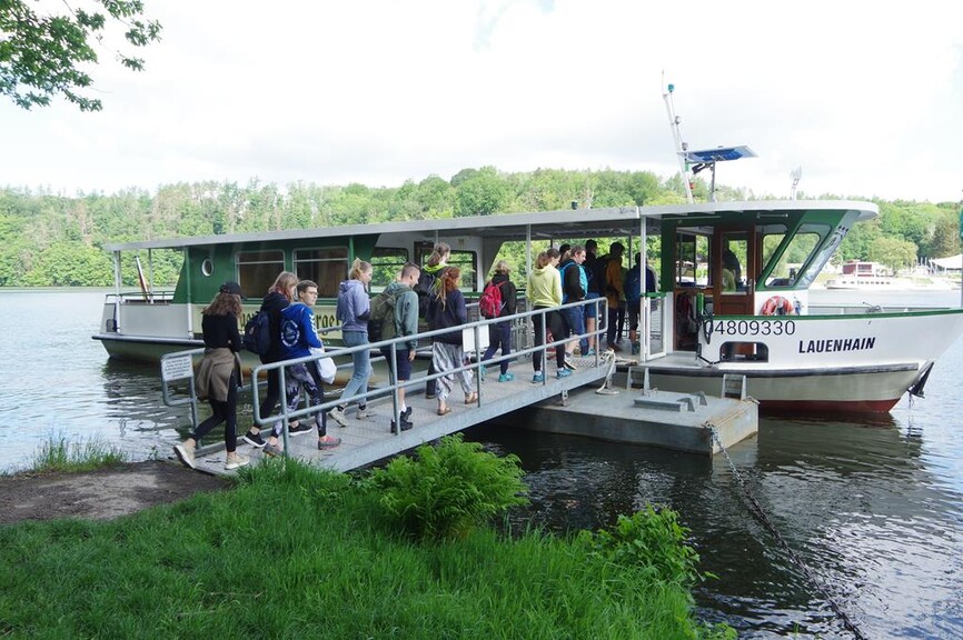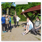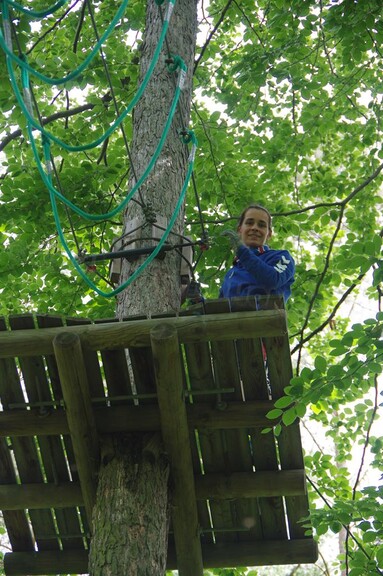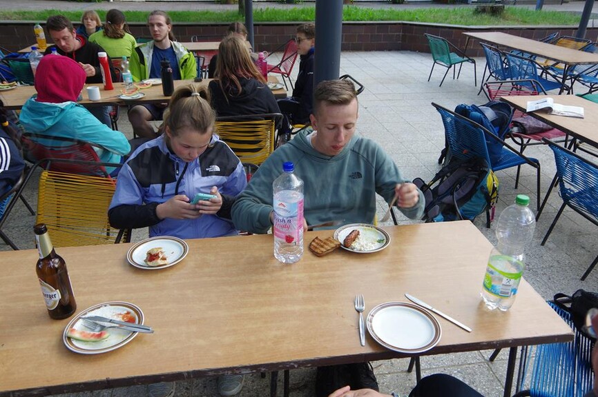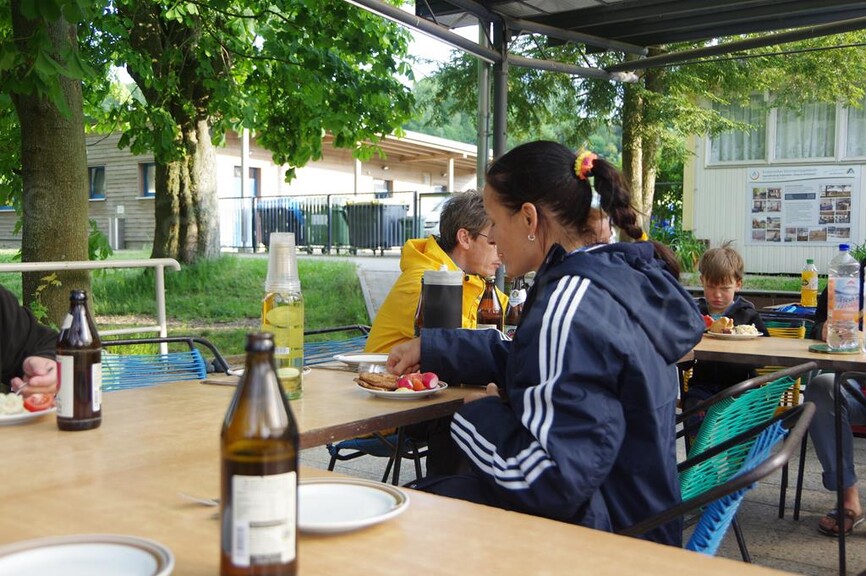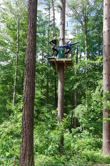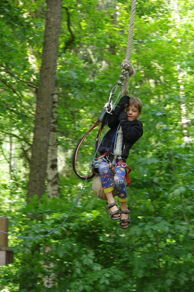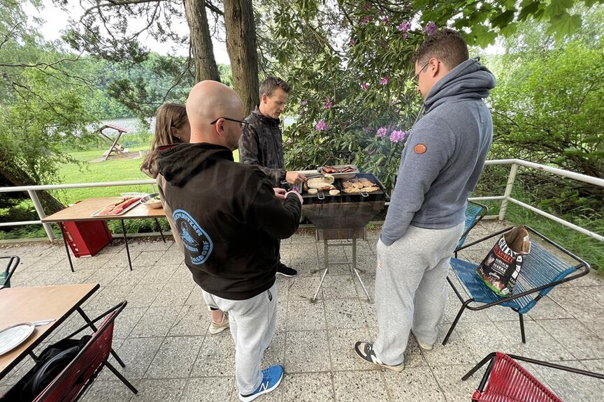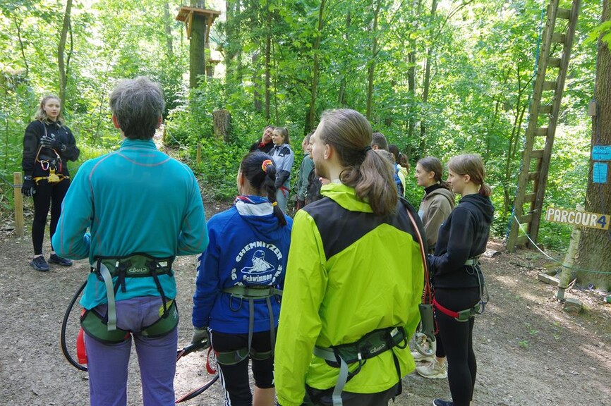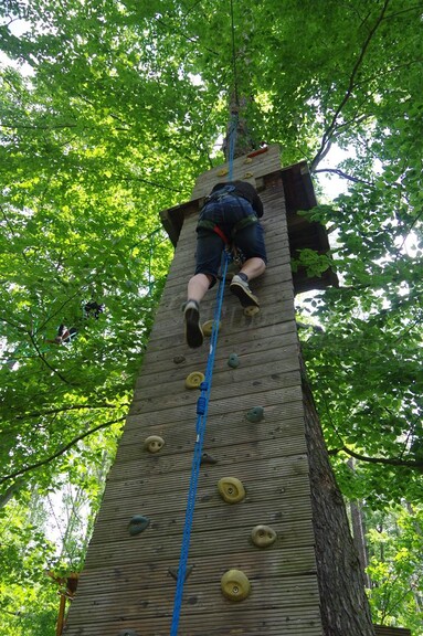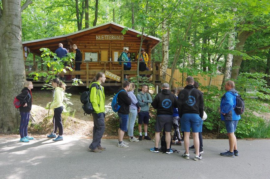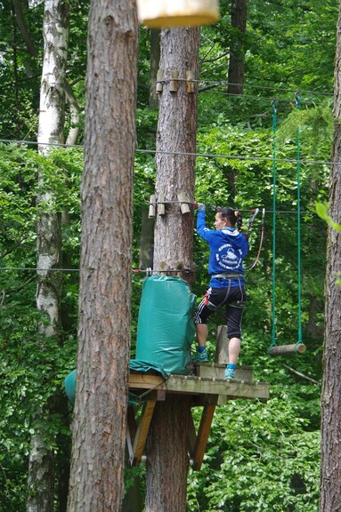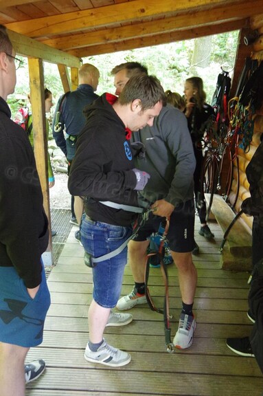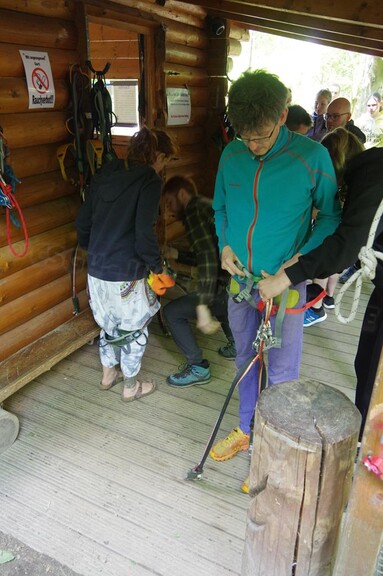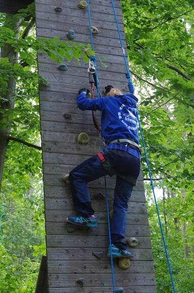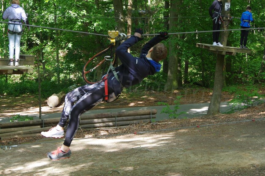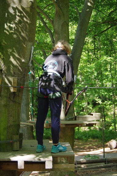 Am Samstag trafen sich einige 07.00 Uhr zum Frühsport: 5 km locker laufen entlang der Talsperre und anschließend noch 5 Runden Mini-Workout auf der Wiese der JH. Nach dem Duschen gab es pünktlich 08.00 Uhr ein reichliches Frühstück. Danach wanderten wir an der Talsperre entlang bis Erlebach, um 10.05 Uhr mit der Fähre nach Kriebstein überzusetzen. Dort stand für alle von 10.30 - 13.00 Uhr Klettern im Kletterwald auf dem Programm. Das Wetter war dafür ideal. Nach einer kurzen Einweisung und dem obligatorischen Probeklettern gab es 6 Parcours zur Auswahl: durch unterschiedliche Höhen und unterschiedliche Schweregrade der einzelnen Kletterelemente war für jeden die passende Herausforderung dabei. Nachdem wir alle Klettergurte wieder abgelegt hatten, holten wir uns am Kiosk noch Pommes oder Roster und fuhren 14.00 Uhr wieder mit der Fähre zurück nach Erlebach und liefen wieder zurück zur Herberge. Nachmittags wollten wir eigentlich noch eine Runde baden bzw. einmal bis zum anderes Ufer schwimmen. Leider hatte das Gewitter vom Vorabend nicht nur die Temperaturen deutlich abgekühlt, es ging auch ziemlich starker Wind. So trauten wir uns nicht ins Wasser, sondern spielten Volleyball oder faulenzten. Zum Abendbrot grillten wir Steaks, Roster und Käse. Auch an diesem zweiten Abend saßen wir wieder gemütlich auf der großen überdachten Terrasse zusammen.