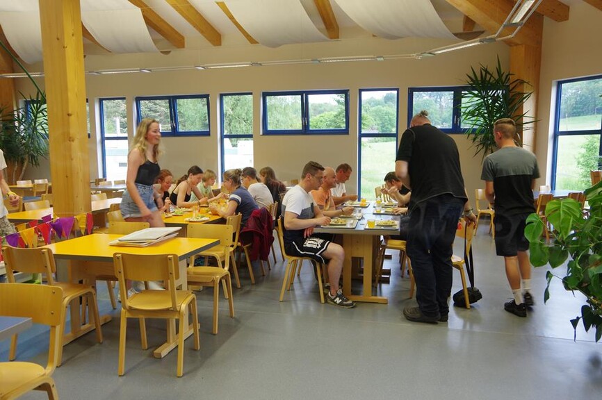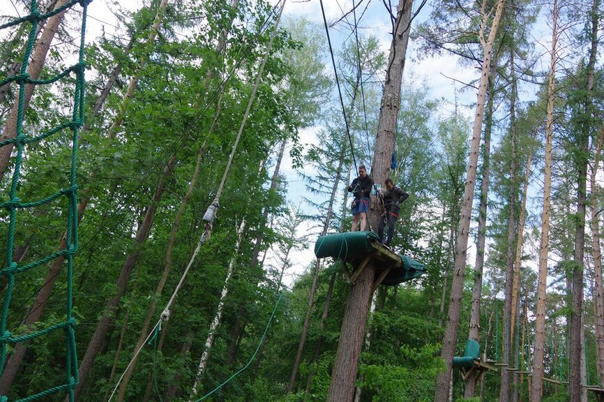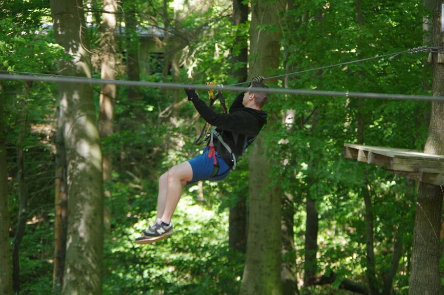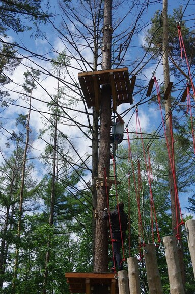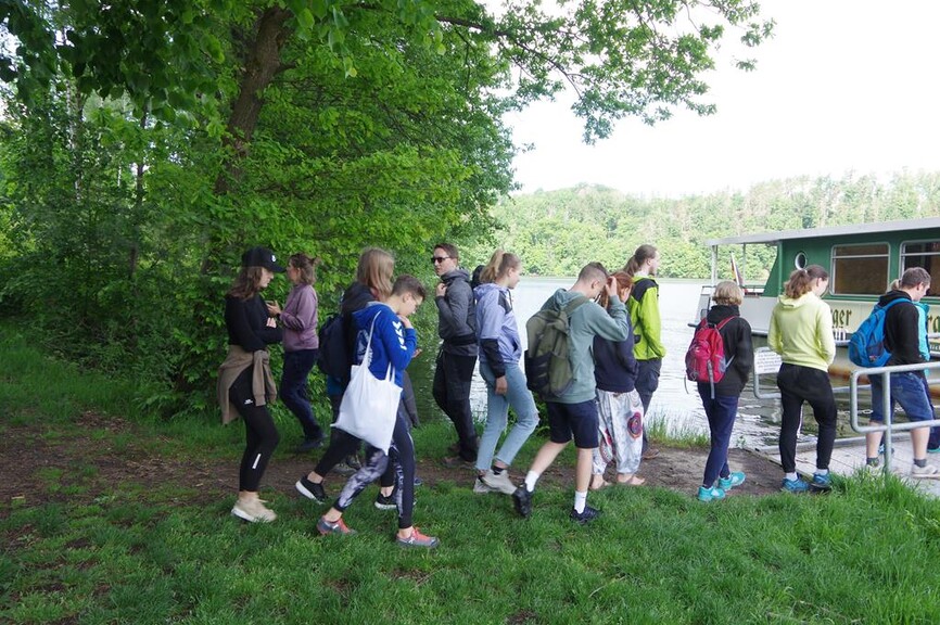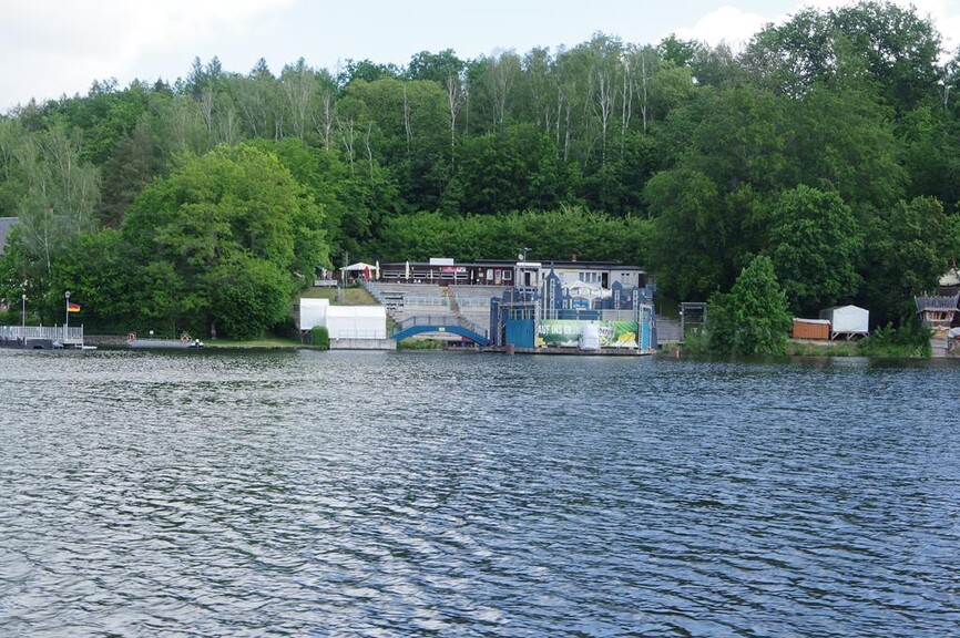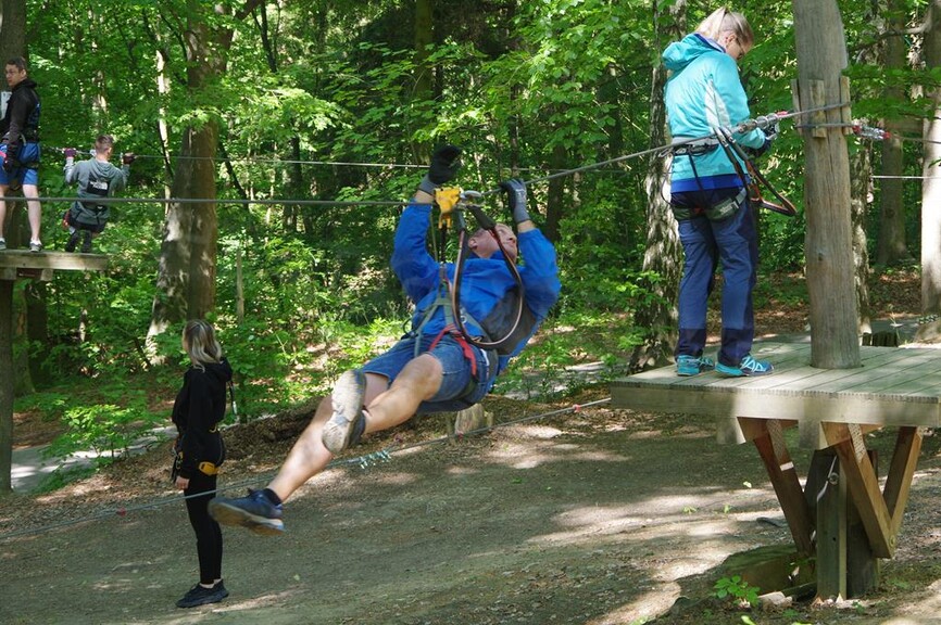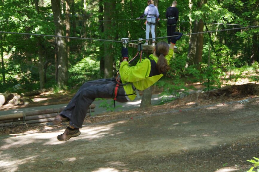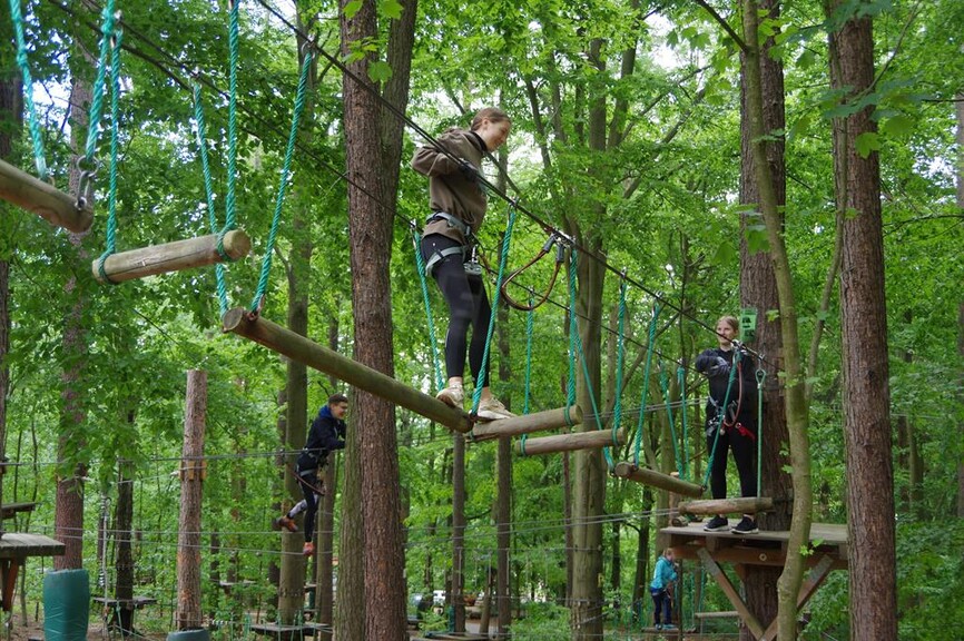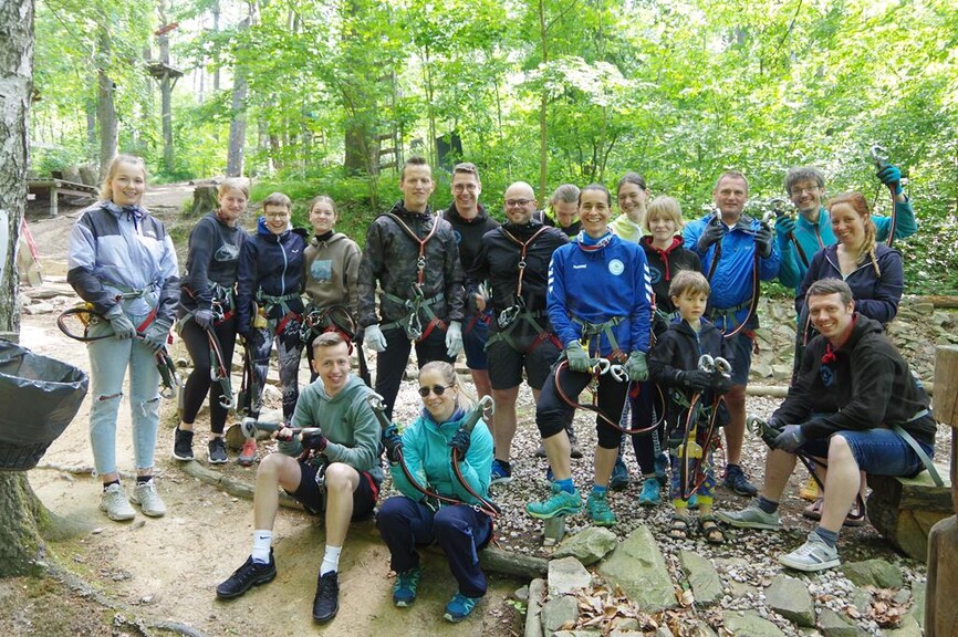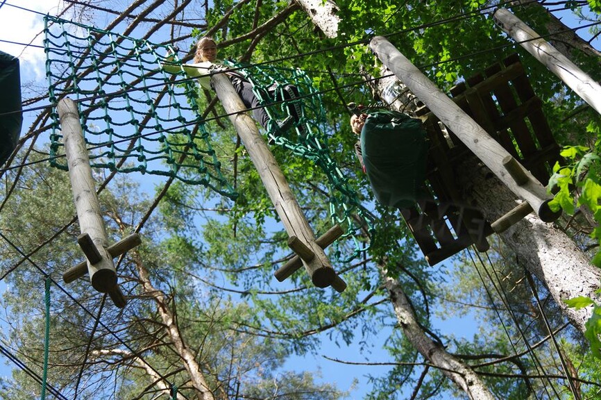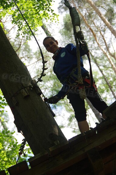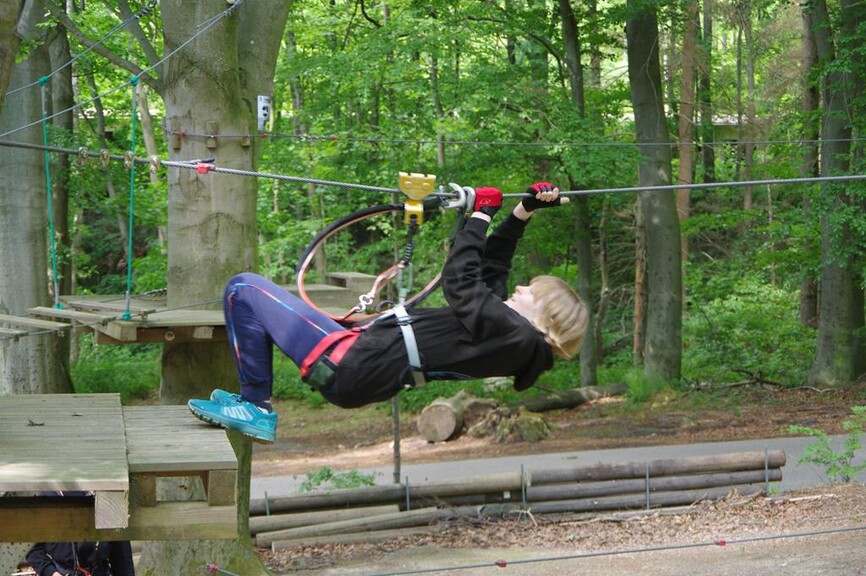 Am Samstag trafen sich einige 07.00 Uhr zum Frühsport: 5 km locker laufen entlang der Talsperre und anschließend noch 5 Runden Mini-Workout auf der Wiese der JH. Nach dem Duschen gab es pünktlich 08.00 Uhr ein reichliches Frühstück. Danach wanderten wir an der Talsperre entlang bis Erlebach, um 10.05 Uhr mit der Fähre nach Kriebstein überzusetzen. Dort stand für alle von 10.30 - 13.00 Uhr Klettern im Kletterwald auf dem Programm. Das Wetter war dafür ideal. Nach einer kurzen Einweisung und dem obligatorischen Probeklettern gab es 6 Parcours zur Auswahl: durch unterschiedliche Höhen und unterschiedliche Schweregrade der einzelnen Kletterelemente war für jeden die passende Herausforderung dabei. Nachdem wir alle Klettergurte wieder abgelegt hatten, holten wir uns am Kiosk noch Pommes oder Roster und fuhren 14.00 Uhr wieder mit der Fähre zurück nach Erlebach und liefen wieder zurück zur Herberge. Nachmittags wollten wir eigentlich noch eine Runde baden bzw. einmal bis zum anderes Ufer schwimmen. Leider hatte das Gewitter vom Vorabend nicht nur die Temperaturen deutlich abgekühlt, es ging auch ziemlich starker Wind. So trauten wir uns nicht ins Wasser, sondern spielten Volleyball oder faulenzten. Zum Abendbrot grillten wir Steaks, Roster und Käse. Auch an diesem zweiten Abend saßen wir wieder gemütlich auf der großen überdachten Terrasse zusammen.