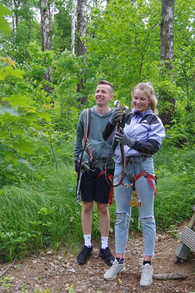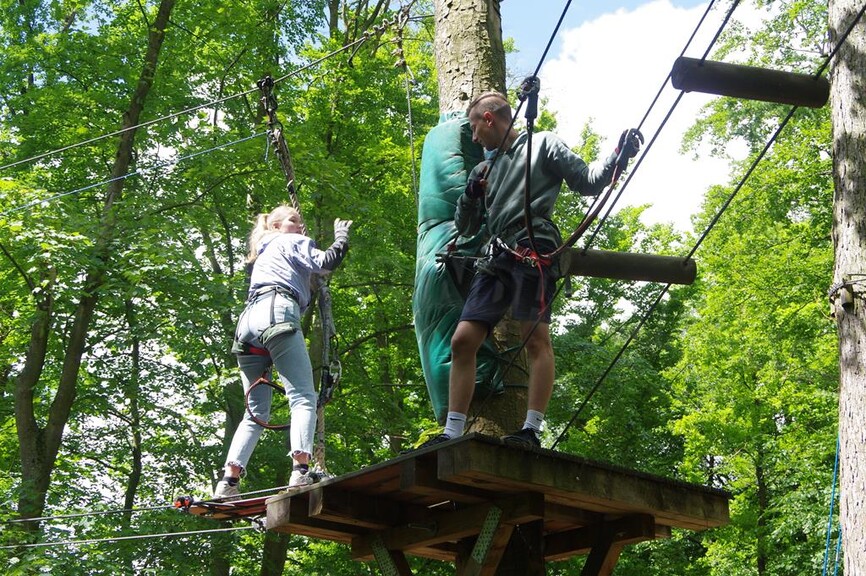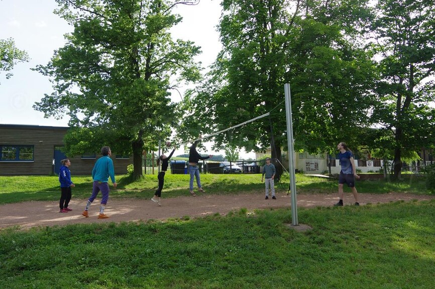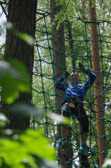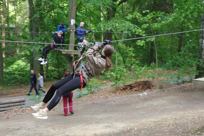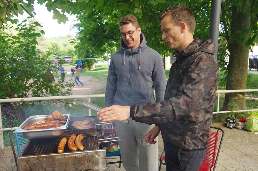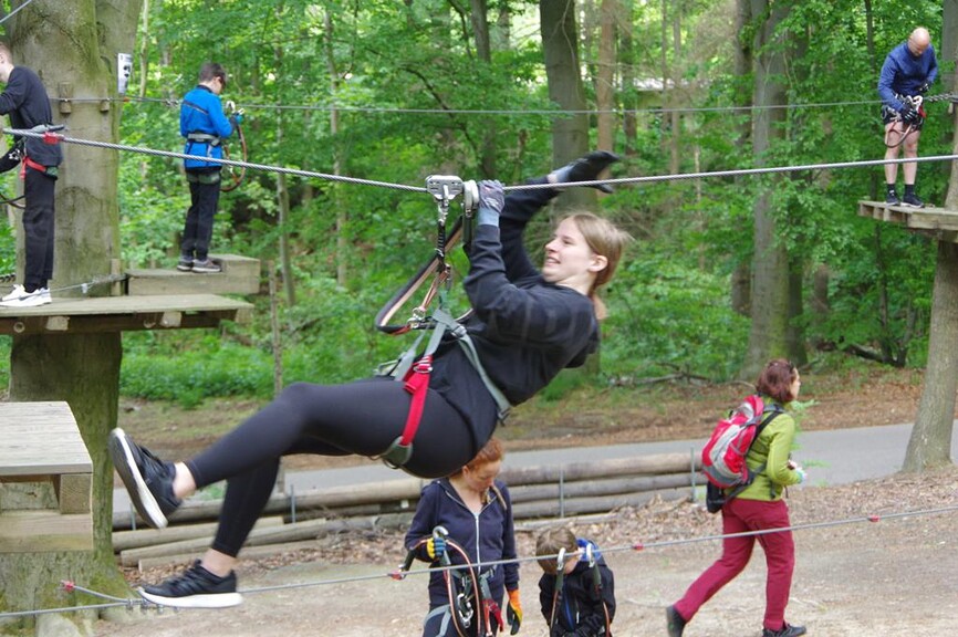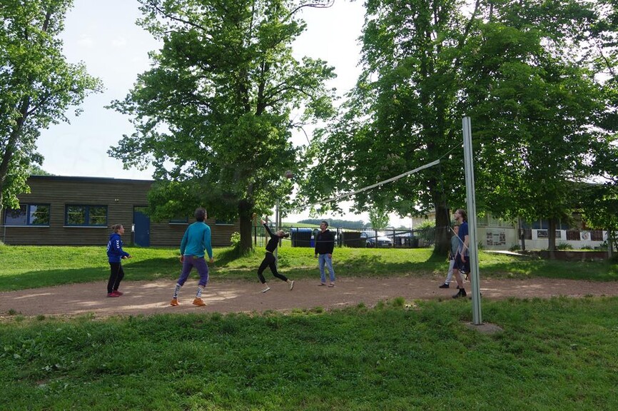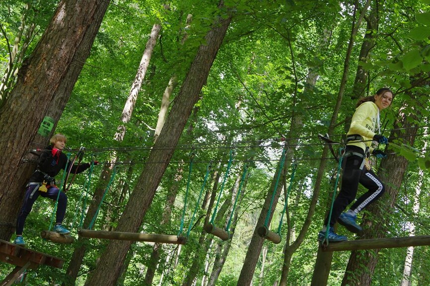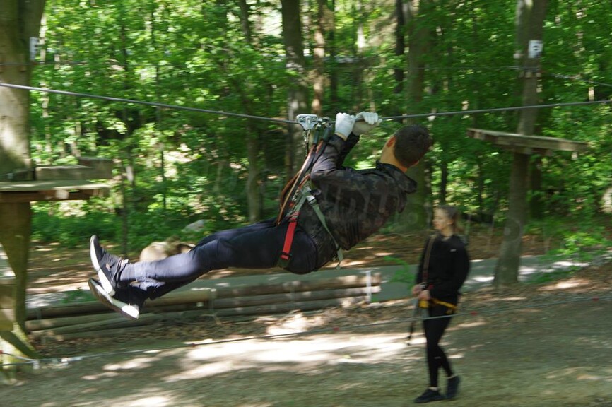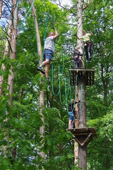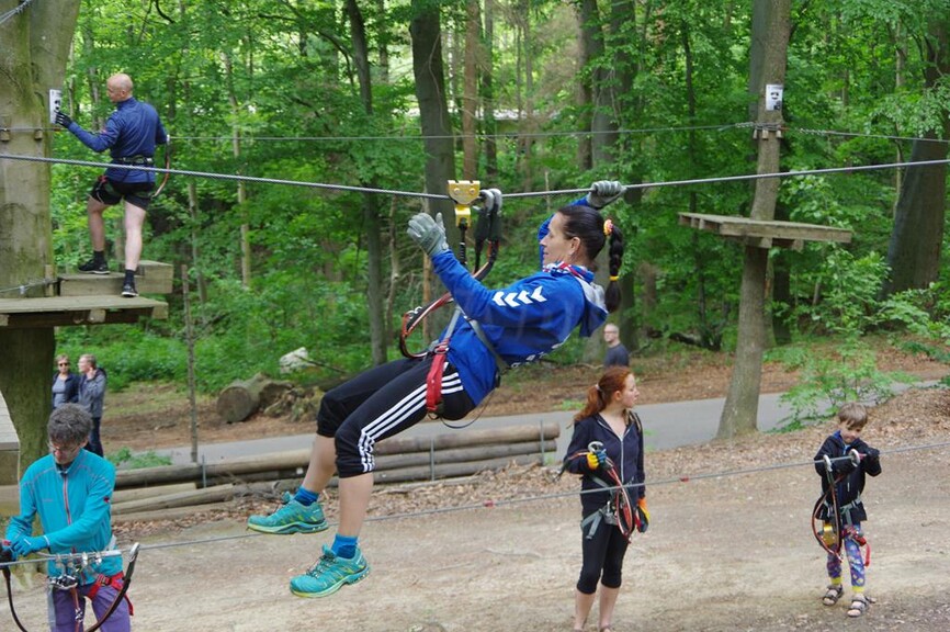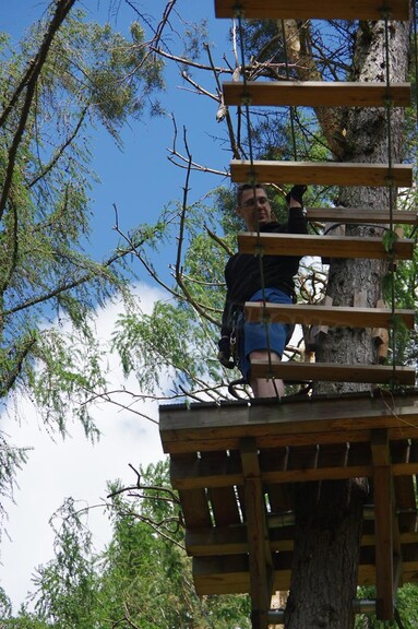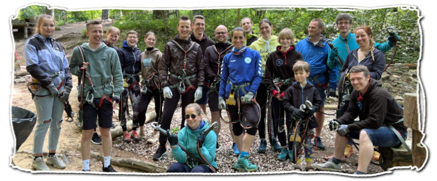 Am Samstag trafen sich einige 07.00 Uhr zum Frühsport: 5 km locker laufen entlang der Talsperre und anschließend noch 5 Runden Mini-Workout auf der Wiese der JH. Nach dem Duschen gab es pünktlich 08.00 Uhr ein reichliches Frühstück. Danach wanderten wir an der Talsperre entlang bis Erlebach, um 10.05 Uhr mit der Fähre nach Kriebstein überzusetzen. Dort stand für alle von 10.30 - 13.00 Uhr Klettern im Kletterwald auf dem Programm. Das Wetter war dafür ideal. Nach einer kurzen Einweisung und dem obligatorischen Probeklettern gab es 6 Parcours zur Auswahl: durch unterschiedliche Höhen und unterschiedliche Schweregrade der einzelnen Kletterelemente war für jeden die passende Herausforderung dabei. Nachdem wir alle Klettergurte wieder abgelegt hatten, holten wir uns am Kiosk noch Pommes oder Roster und fuhren 14.00 Uhr wieder mit der Fähre zurück nach Erlebach und liefen wieder zurück zur Herberge. Nachmittags wollten wir eigentlich noch eine Runde baden bzw. einmal bis zum anderes Ufer schwimmen. Leider hatte das Gewitter vom Vorabend nicht nur die Temperaturen deutlich abgekühlt, es ging auch ziemlich starker Wind. So trauten wir uns nicht ins Wasser, sondern spielten Volleyball oder faulenzten. Zum Abendbrot grillten wir Steaks, Roster und Käse. Auch an diesem zweiten Abend saßen wir wieder gemütlich auf der großen überdachten Terrasse zusammen.