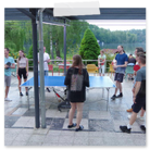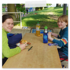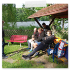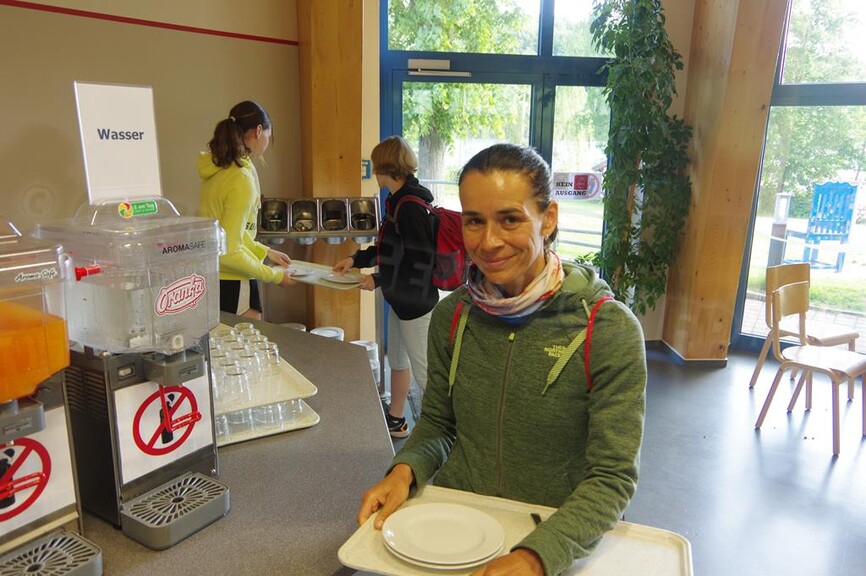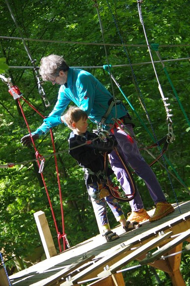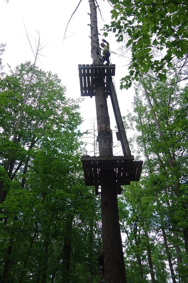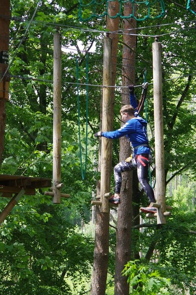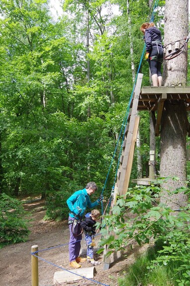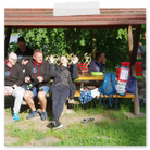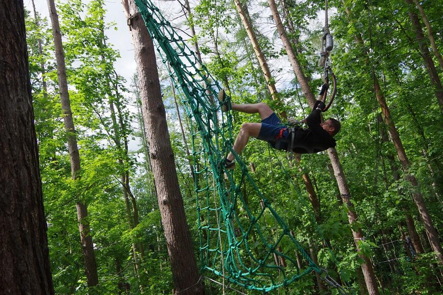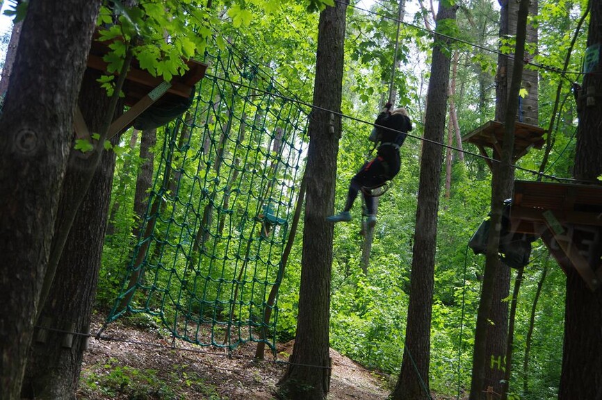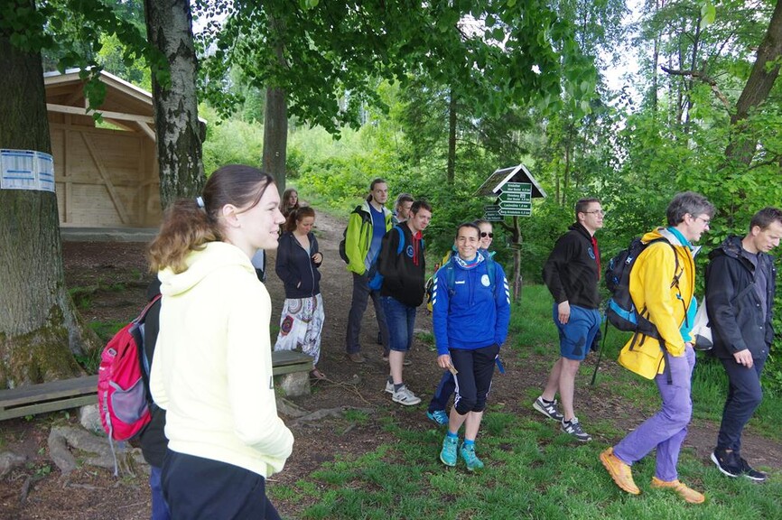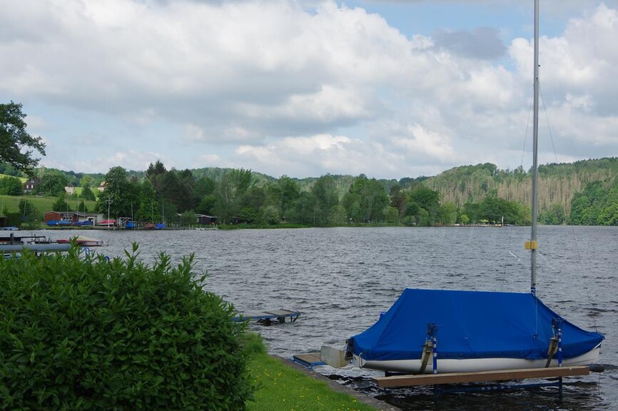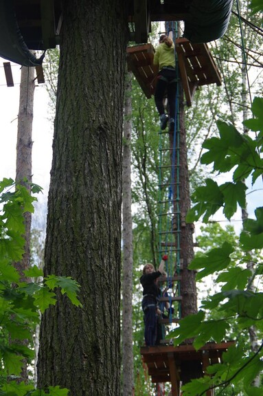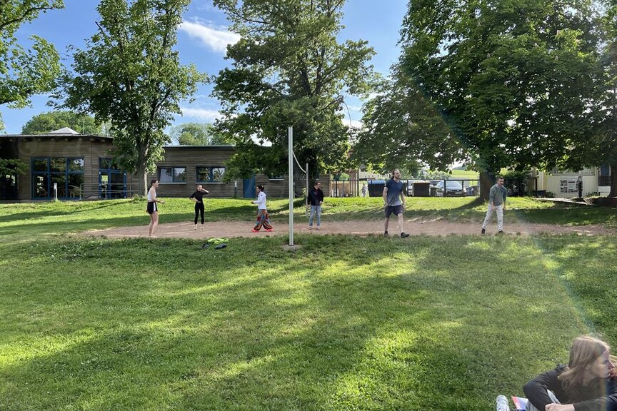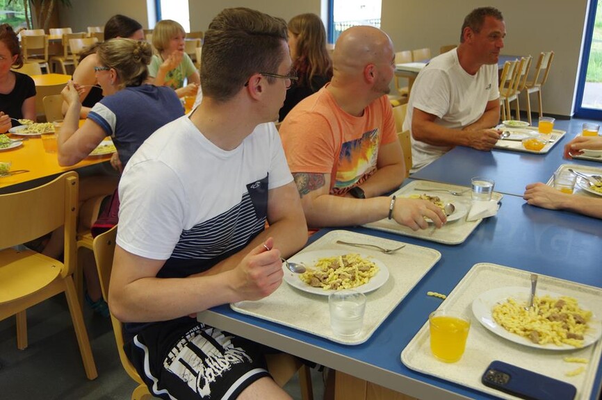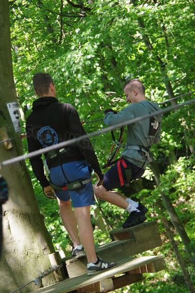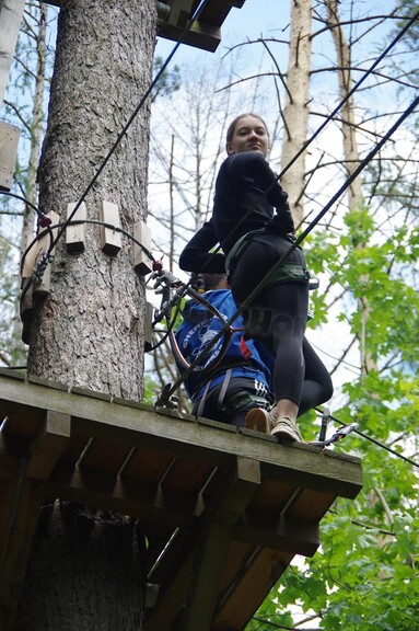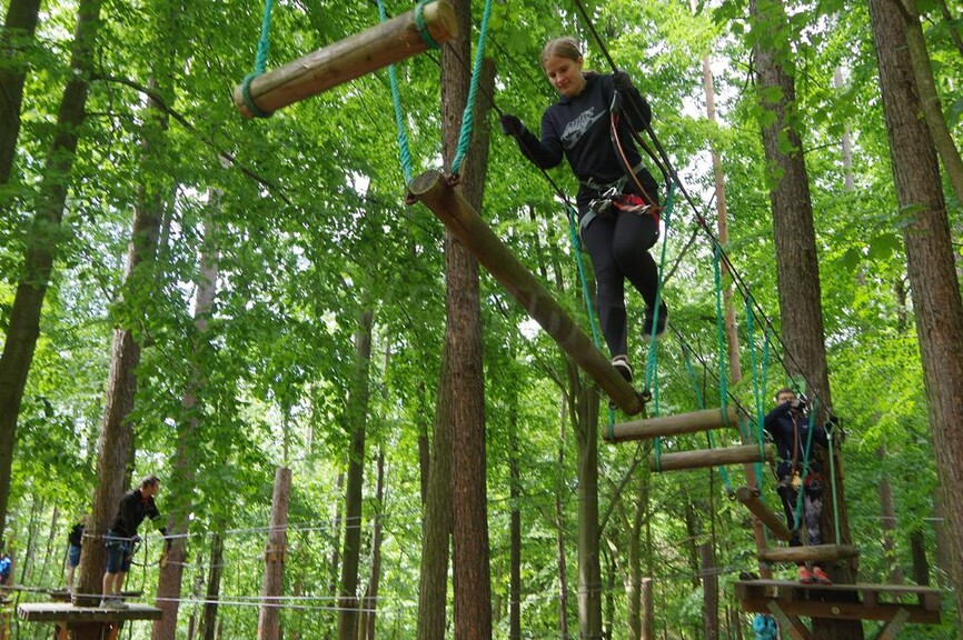 Am Samstag trafen sich einige 07.00 Uhr zum Frühsport: 5 km locker laufen entlang der Talsperre und anschließend noch 5 Runden Mini-Workout auf der Wiese der JH. Nach dem Duschen gab es pünktlich 08.00 Uhr ein reichliches Frühstück. Danach wanderten wir an der Talsperre entlang bis Erlebach, um 10.05 Uhr mit der Fähre nach Kriebstein überzusetzen. Dort stand für alle von 10.30 - 13.00 Uhr Klettern im Kletterwald auf dem Programm. Das Wetter war dafür ideal. Nach einer kurzen Einweisung und dem obligatorischen Probeklettern gab es 6 Parcours zur Auswahl: durch unterschiedliche Höhen und unterschiedliche Schweregrade der einzelnen Kletterelemente war für jeden die passende Herausforderung dabei. Nachdem wir alle Klettergurte wieder abgelegt hatten, holten wir uns am Kiosk noch Pommes oder Roster und fuhren 14.00 Uhr wieder mit der Fähre zurück nach Erlebach und liefen wieder zurück zur Herberge. Nachmittags wollten wir eigentlich noch eine Runde baden bzw. einmal bis zum anderes Ufer schwimmen. Leider hatte das Gewitter vom Vorabend nicht nur die Temperaturen deutlich abgekühlt, es ging auch ziemlich starker Wind. So trauten wir uns nicht ins Wasser, sondern spielten Volleyball oder faulenzten. Zum Abendbrot grillten wir Steaks, Roster und Käse. Auch an diesem zweiten Abend saßen wir wieder gemütlich auf der großen überdachten Terrasse zusammen.
