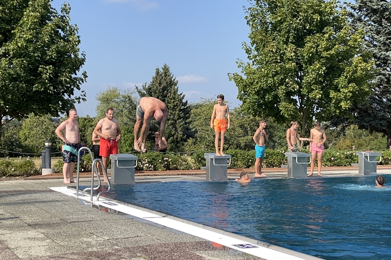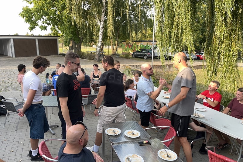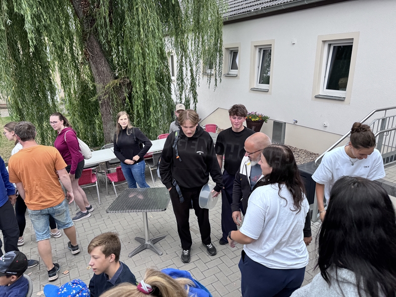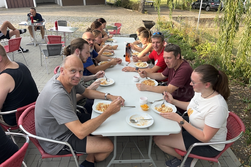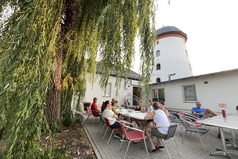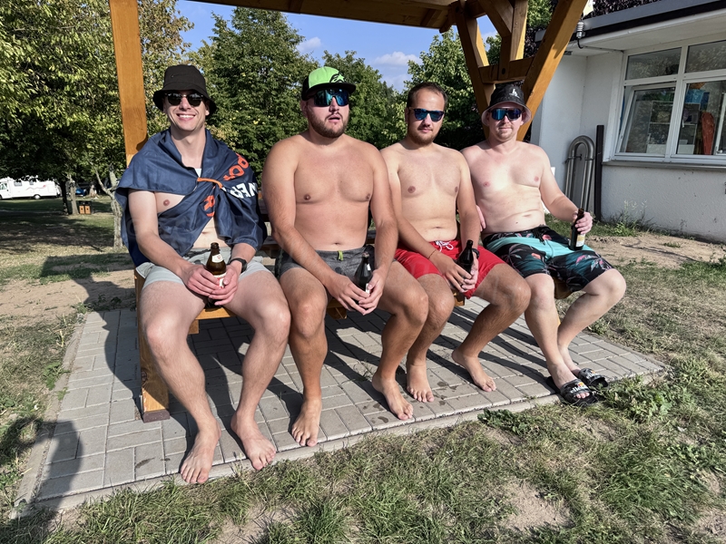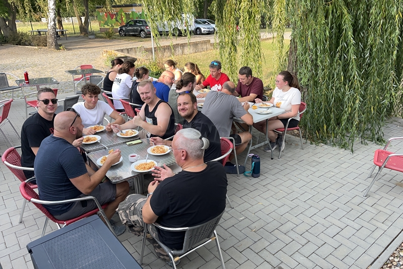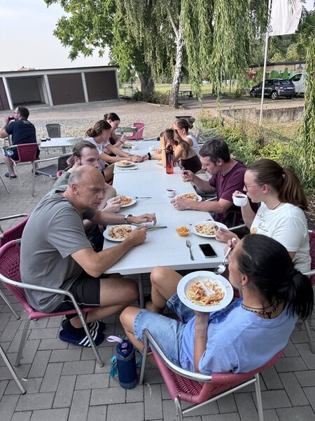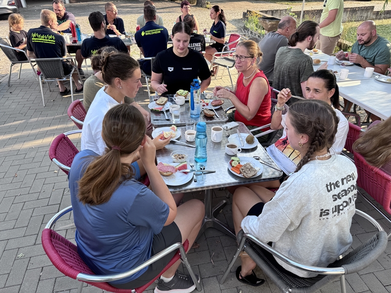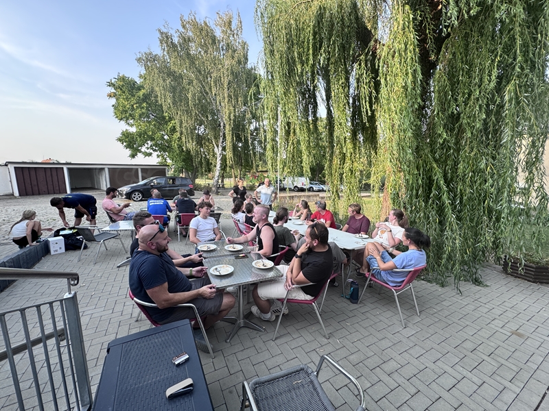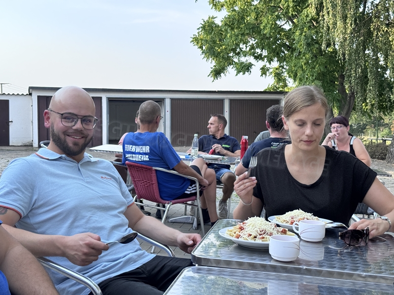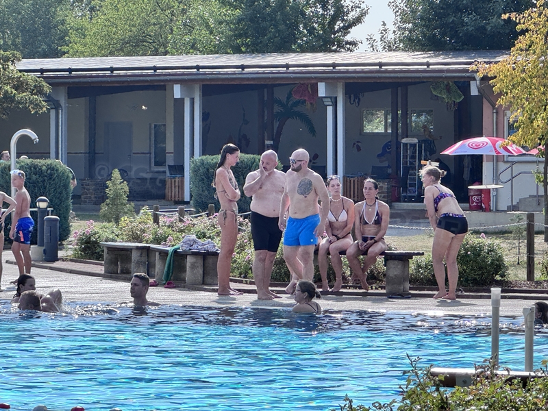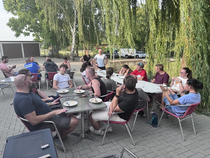 Nachdem wir uns 7 lange Wochen beim Training nicht gesehen hatten, begann das neue Sportjahr 2025/26 für 21 Schwimmer vom 15.08. – 17.08.25 mit dem Trainingslager in der JH „Strehla“ bei Riesa. Fast alle waren am Freitag 16.30 – 18.00 Uhr pünktlich in der alten Mühle angereist. Der Sommer hatte es bereits letzte Woche sehr gut gemeint und die Temperaturen lagen deutlich über 30°C, was auch an diesem Abend so war. So setzten wir uns zum und nach dem Abendessen einfach gemütlich vor die Jugendherberge zusammen und erzählten ausgiebig und bis nach Mitternacht. (Zum Schlafen in den Zimmern war es eh zu warm.) Julian, der an diesem Tag Geburtstag hatte und Jessi, deren Geburtstag schon ein paar Tage zurück lag, bekamen jeweils Kuchen geschenkt und alle freuten sich, über den leckeren Nachtisch.
