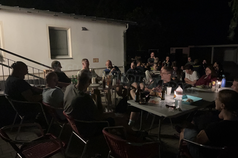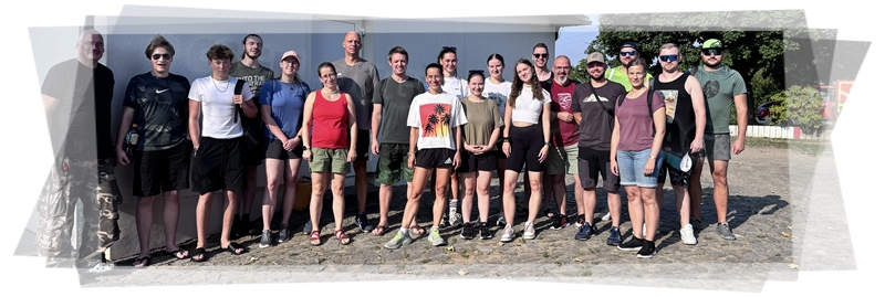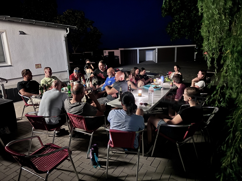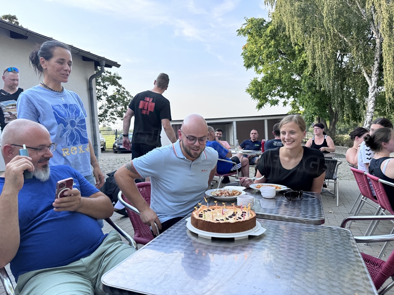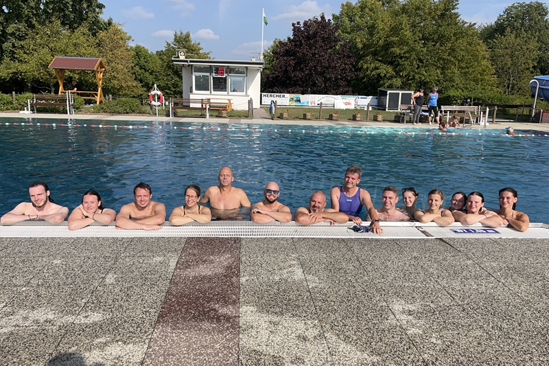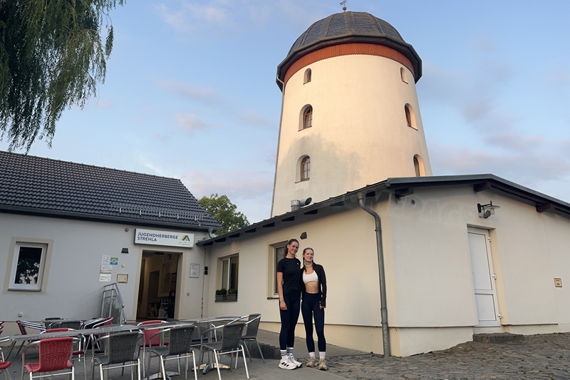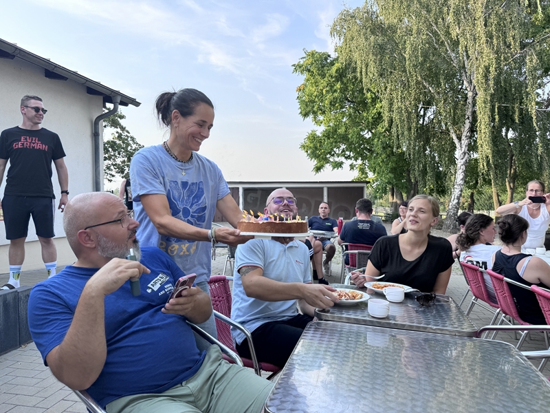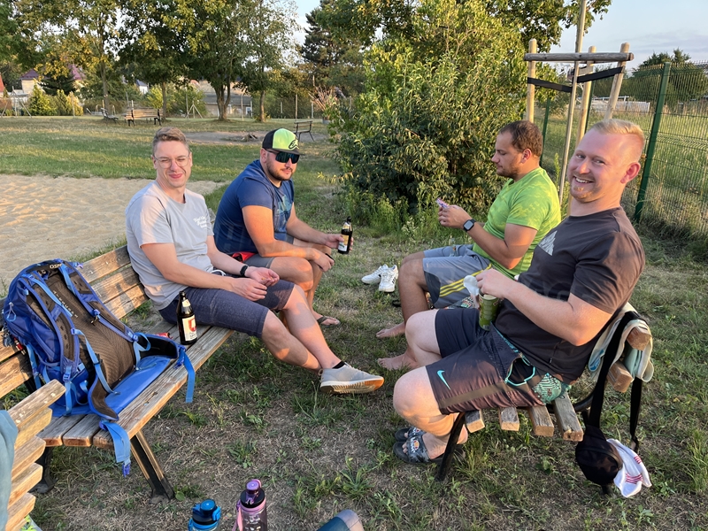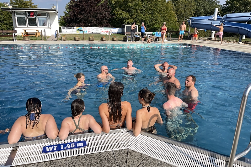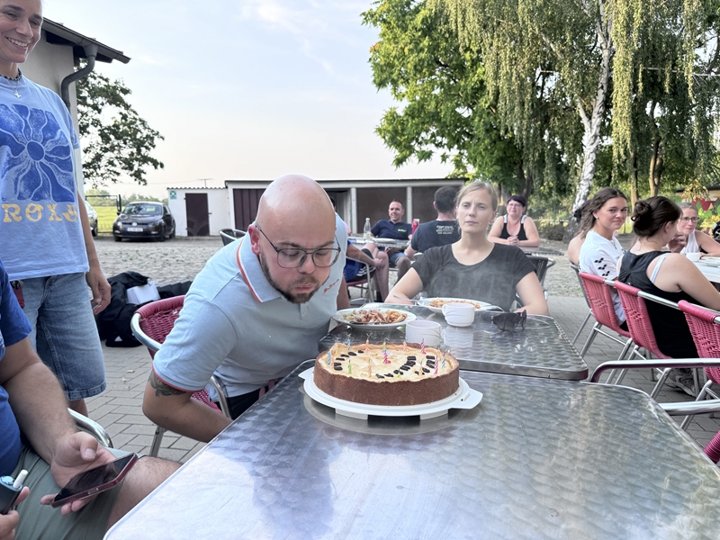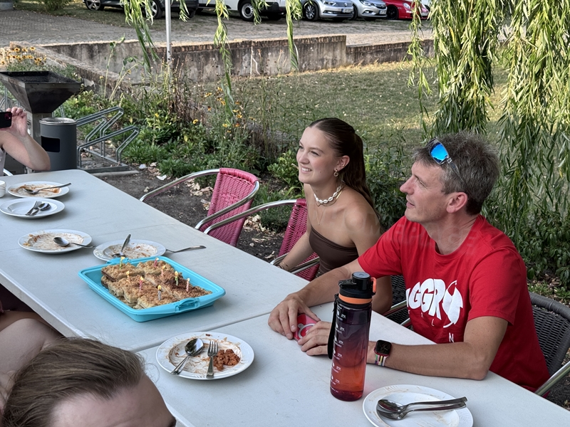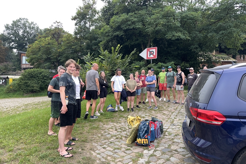 Nachdem wir uns 7 lange Wochen beim Training nicht gesehen hatten, begann das neue Sportjahr 2025/26 für 21 Schwimmer vom 15.08. – 17.08.25 mit dem Trainingslager in der JH „Strehla“ bei Riesa. Fast alle waren am Freitag 16.30 – 18.00 Uhr pünktlich in der alten Mühle angereist. Der Sommer hatte es bereits letzte Woche sehr gut gemeint und die Temperaturen lagen deutlich über 30°C, was auch an diesem Abend so war. So setzten wir uns zum und nach dem Abendessen einfach gemütlich vor die Jugendherberge zusammen und erzählten ausgiebig und bis nach Mitternacht. (Zum Schlafen in den Zimmern war es eh zu warm.) Julian, der an diesem Tag Geburtstag hatte und Jessi, deren Geburtstag schon ein paar Tage zurück lag, bekamen jeweils Kuchen geschenkt und alle freuten sich, über den leckeren Nachtisch.