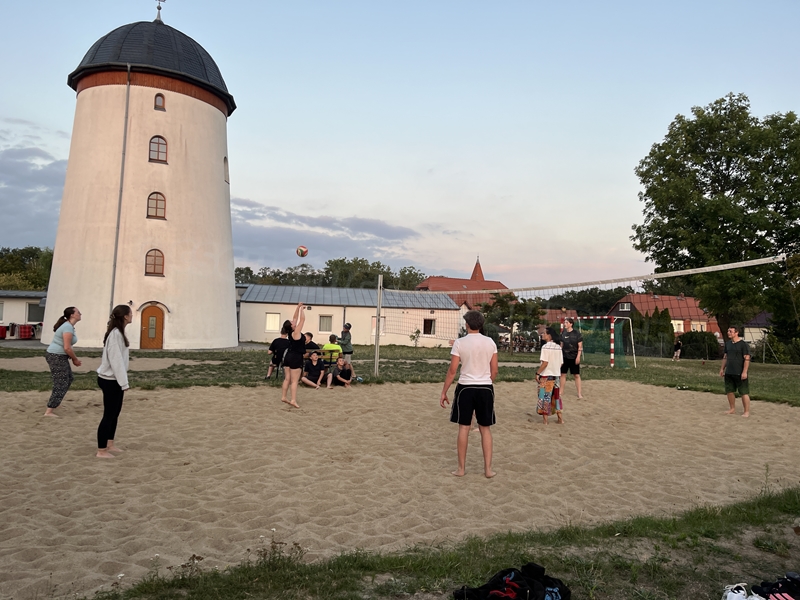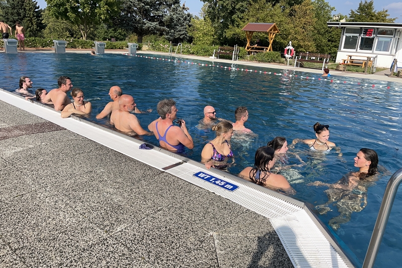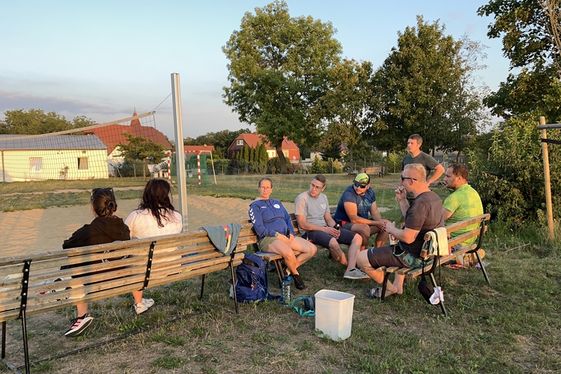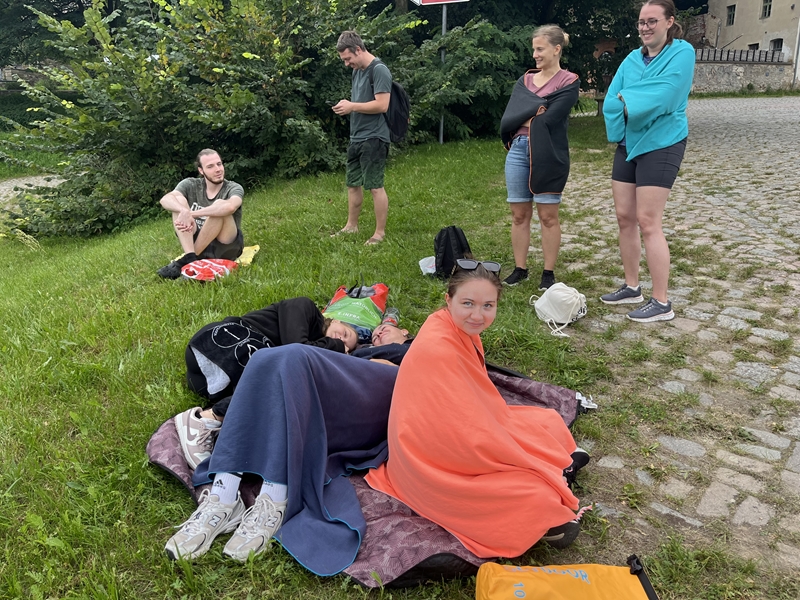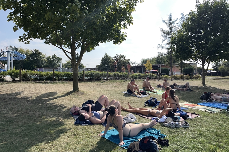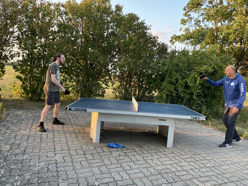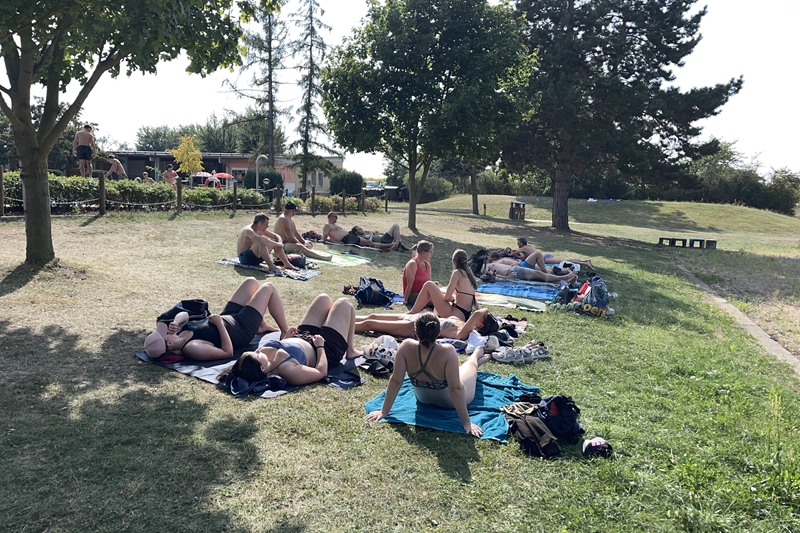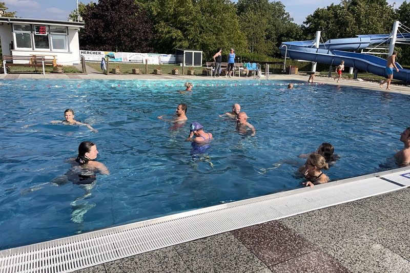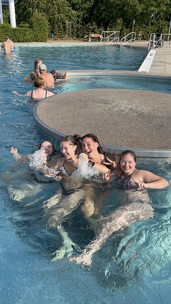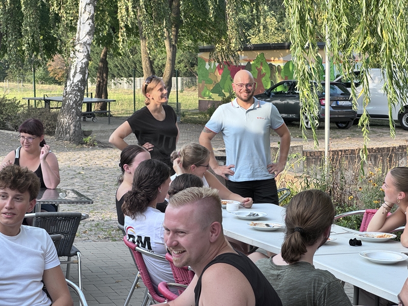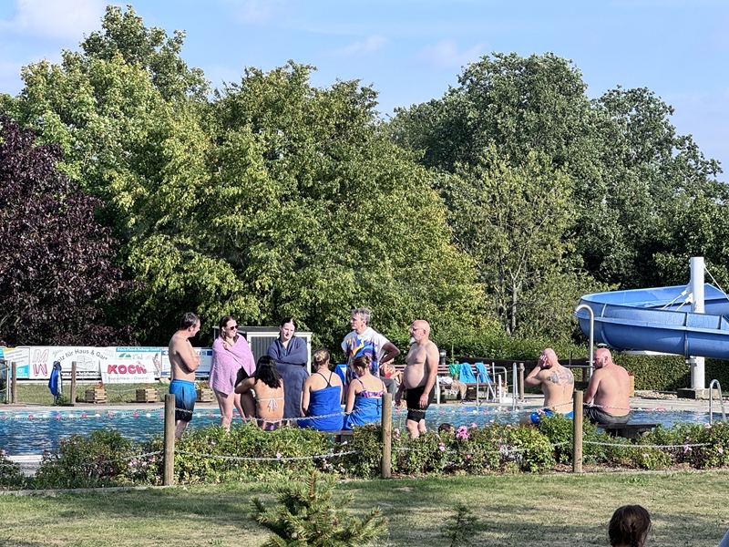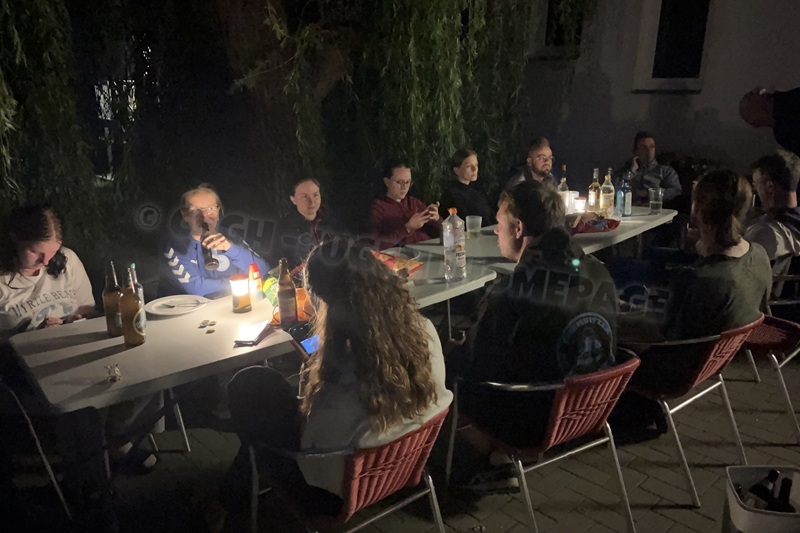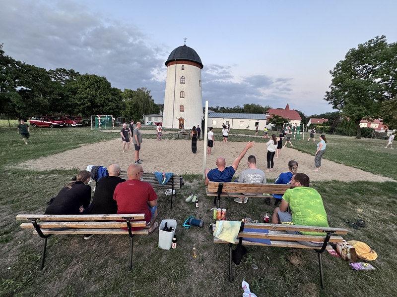 Nachdem wir uns 7 lange Wochen beim Training nicht gesehen hatten, begann das neue Sportjahr 2025/26 für 21 Schwimmer vom 15.08. – 17.08.25 mit dem Trainingslager in der JH „Strehla“ bei Riesa. Fast alle waren am Freitag 16.30 – 18.00 Uhr pünktlich in der alten Mühle angereist. Der Sommer hatte es bereits letzte Woche sehr gut gemeint und die Temperaturen lagen deutlich über 30°C, was auch an diesem Abend so war. So setzten wir uns zum und nach dem Abendessen einfach gemütlich vor die Jugendherberge zusammen und erzählten ausgiebig und bis nach Mitternacht. (Zum Schlafen in den Zimmern war es eh zu warm.) Julian, der an diesem Tag Geburtstag hatte und Jessi, deren Geburtstag schon ein paar Tage zurück lag, bekamen jeweils Kuchen geschenkt und alle freuten sich, über den leckeren Nachtisch.