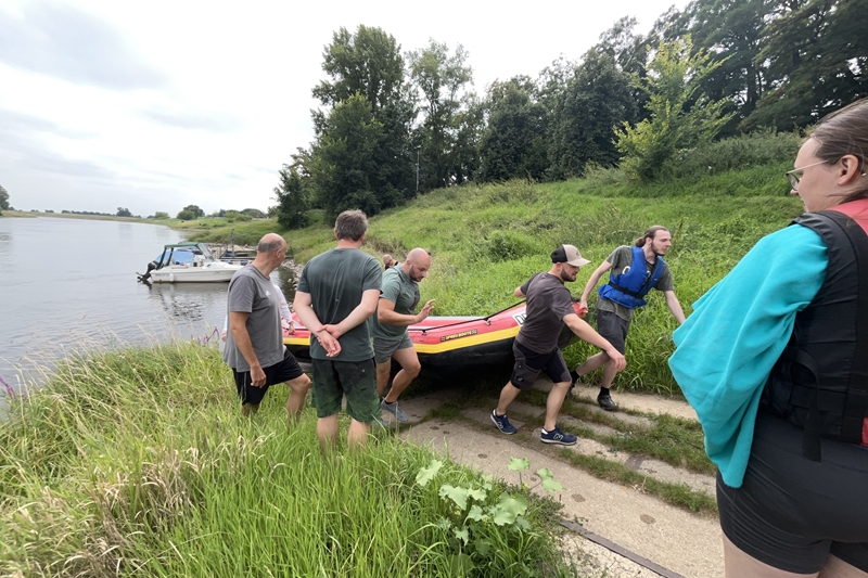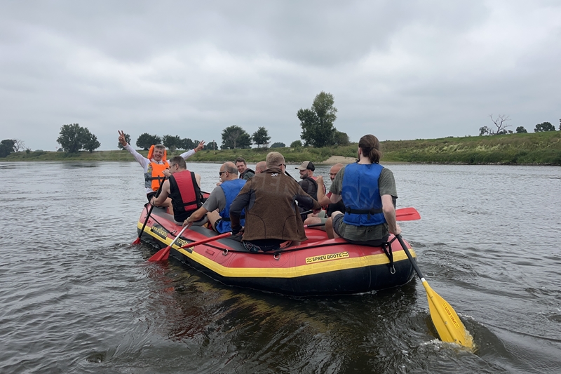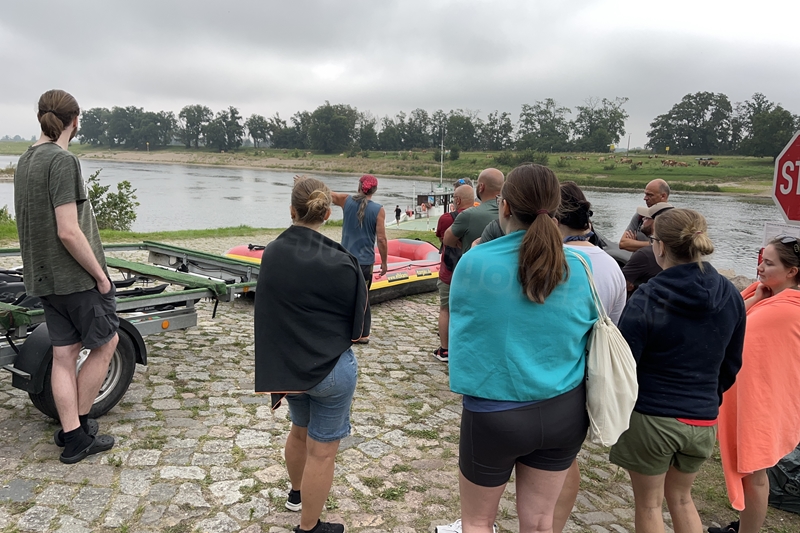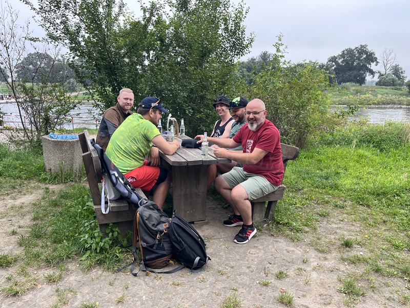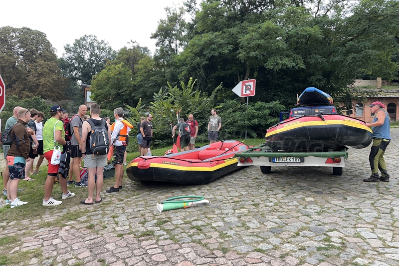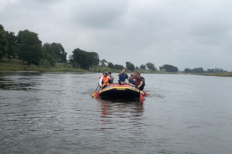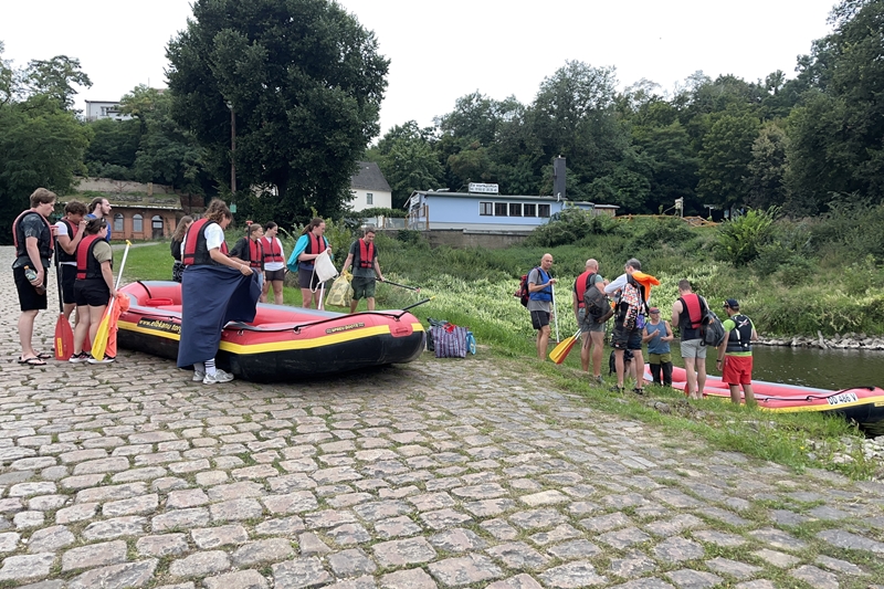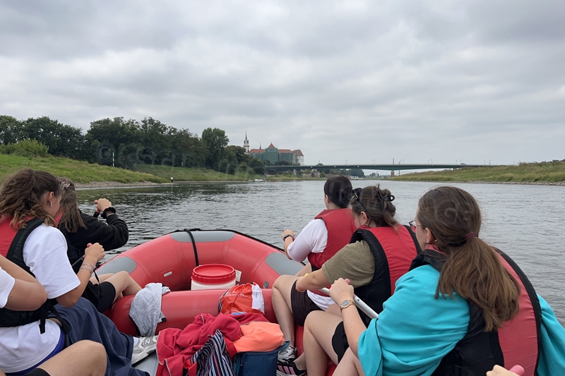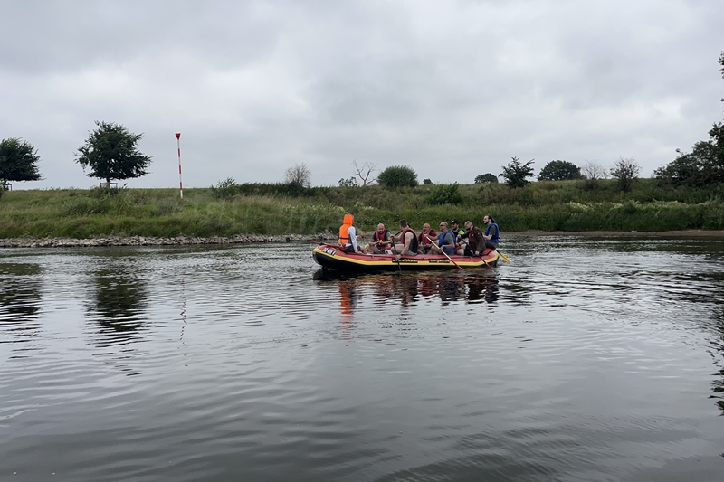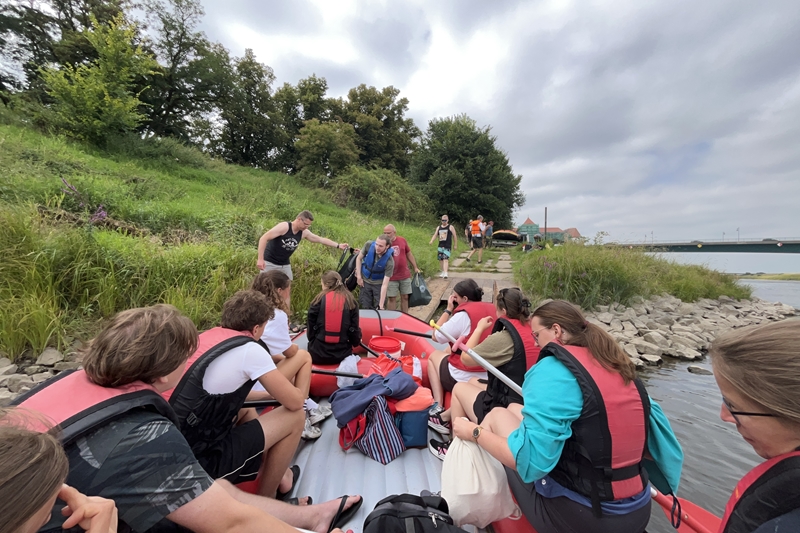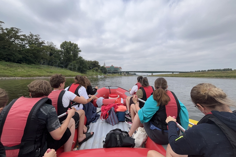 Zum Frühsport am Samstag quälten sich immerhin vier von uns aus den Betten und joggten an der Elbe bei Sonnenaufgang 7 km. 07.30 Uhr gab es für alle Frühstück. Danach brachen wir mit 4 Autos auf nach Belgern zur Elbfähre. Dort setzten wir alle Mitfahrer ab, denn Belgern war 10.00 Uhr der Startpunkt für unsere Schlauchboottour bis Torgau. Die Autofahrer fuhren weiter bis Torgau, wo wir uns 09.45 Uhr mit Herrn Schulze vom „ElbKanu Torgau“ trafen, der uns 4 zusammen mit den Booten wieder mit nach Belgern nahm. Der Plan funktionierte so weit gut. Das einzige Problem war das Wetter. Es hatte sich eine dicke Wolkenschicht vor die Sonne geschoben und so waren es keine 35°C mehr, sondern kühle 20°C. Dafür hatten wir viel zu wenig Klamotten mit. Zum Glück gab es wenigstens Schwimmwesten. Wir setzten die zwei großen Schlauchboote mit ein und startet 10.30 Uhr bei Kilometer 140 elbabwärts aber mit ordentlich Gegenwind. Durch das Paddeln wurde es etwas wärmer. Bei Kilometer 148 zogen wir 12.00 Uhr die Boote aus der Elbe und grillten uns unsere mitgebrachten Lebensmittel zum Mittag. Zwei Mutige sprangen sogar in die Elbe und schwammen flussaufwärts. 13.00 Uhr ging es weiter bis zur Elbbrücke in Torgau beim Kilometer 154,4, wo Herr Schulze 14.30 Uhr schon bereitstand und seine Boote wieder in Empfang nahm. Inzwischen hatte es auch die Sonne durch die Wolken geschafft und wir konnten nach der Rückankunft in der JH direkt zum „Nixenbad“ in Strehla laufen. Bei 25°C Außentemperatur und 26°C Wassertemperatur konnte man es gut im Wasser aushalten und so hatten wir beim Plantschen und Rutschen jede Menge Spaß. 18.30 Uhr zum Abendessen in der Herberge waren alle richtig hungrig und freuten sich über Vorsuppe, Schnitzel mit Pommes und Blumenkohl und Salat. An dem Abend war es weniger warm als gestern. Wir spielten bis zur Finsternis Volleyball hinter der Mühle. Anschließend hockten noch einmal alle zusammen vorm Haus und quatschten.