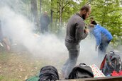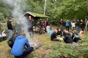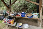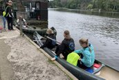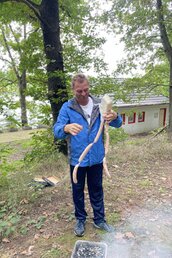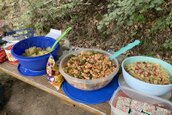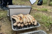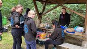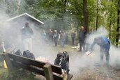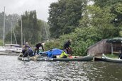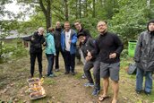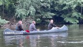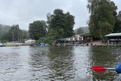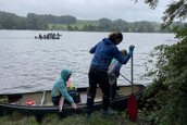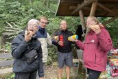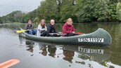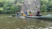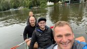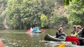 Fast pünktlich 10.15 Uhr waren alle eingetroffen. Wir beluden unsere 6 Kanus mit ausreichend Essbarem und natürlich Getränken und starteten in Richtung Staumauer. Mit viel guter Laune und mehr oder weniger Paddelerfahrung fuhren wir gemütlich knapp 2 Stunden bis zu unserem anvisiertem Ziel: dem kleinen Wäldchen kurz vorm Fähranleger Höfchen am linken Ufer. Dort machten wir unsere Boote fest und suchten uns einen geschützten Platz zum Grillen. Etwa drei Stunden grillten, lachten, quatschten, lachten, aßen, tranken, lachten und genossen die gemeinsame Zeit. Gegen 14.00 Uhr begann es zu nieseln. Wir packten unsere Sachen und fuhren - diesmal etwas schneller - wieder zurück zum Abenteuercamp. Von dort aus ging es in Fahrgemeinschaften zurück nach Hause.