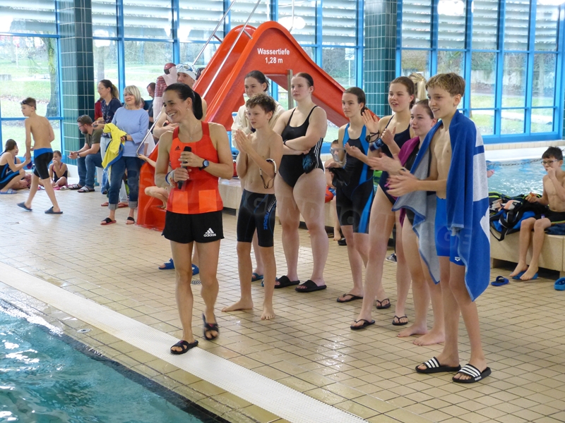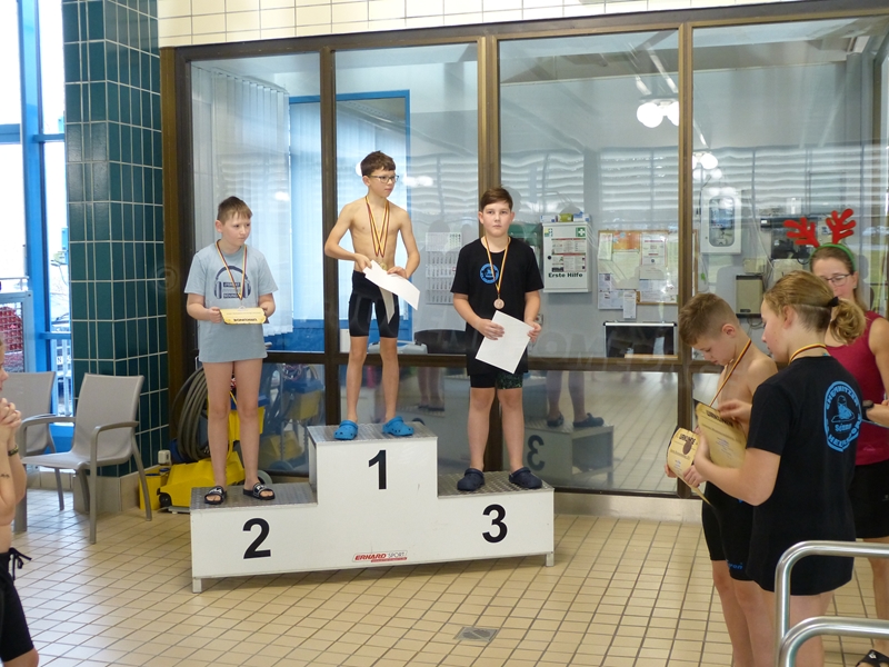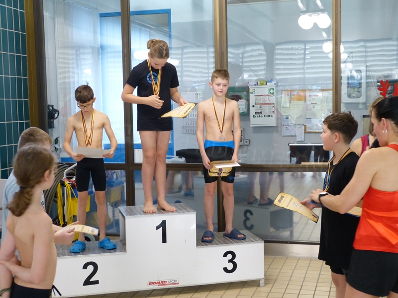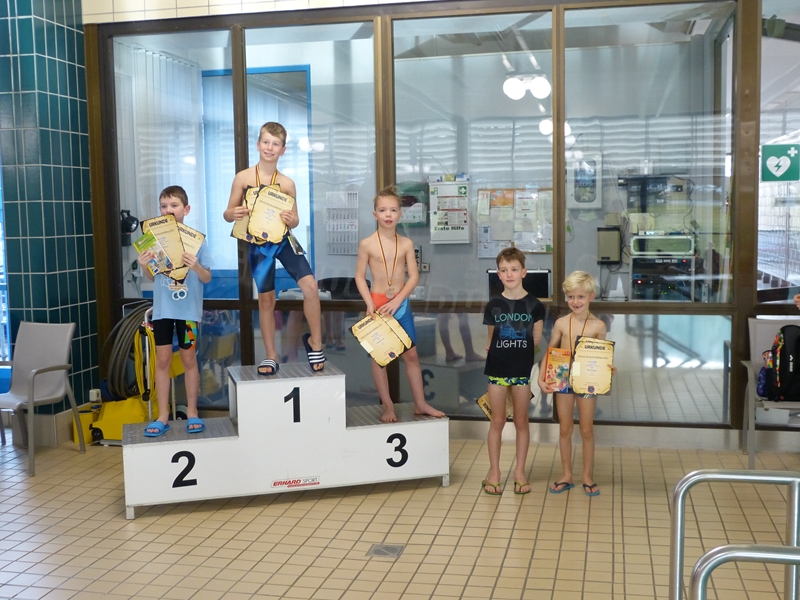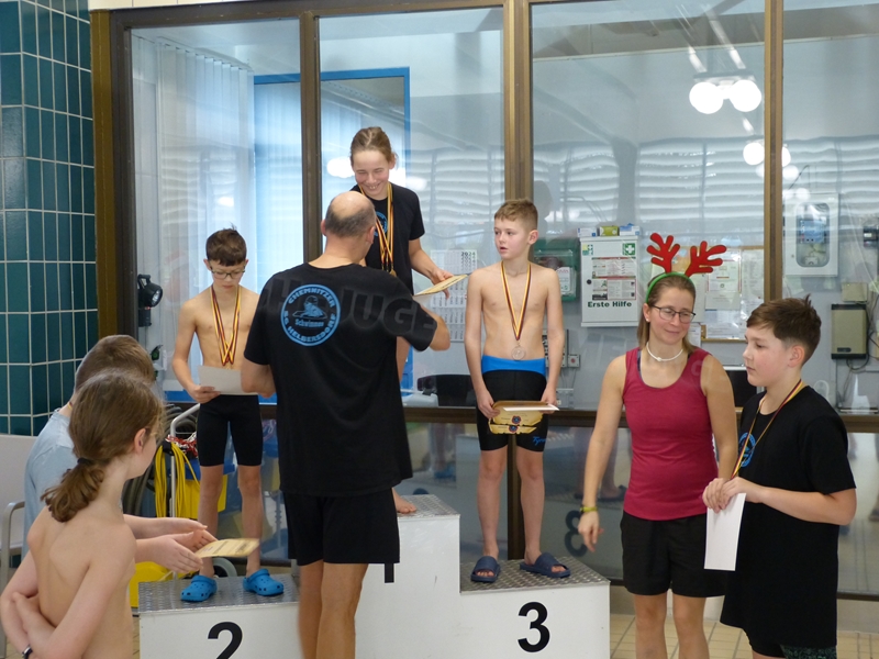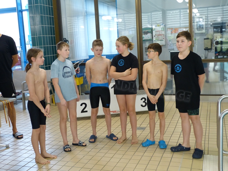 Zu den Staffeln teilten wir die mehr als 50 Kinder und Jugendliche in 5 Teams ein. Geschwommen wurden Querbahnen mit Matten, Lichtern, Enten oder Bechern. Natürlich durfte auch das beliebte Kalender leer essen nicht fehlen. Zum Abschluss suchten wir beim "jeder gegen jeden" bei den Kleinen (JG 2011 und jünger) und bei den Großen (JG 2010 und älter) den schnellsten Schwimmer im Wasser. Dabei konnte Mario erneut den so begehrten Wanderpokal mit nach Hause nehmen.
