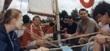 Zu einem kleinen Segeltrip auf der Talsperre Pöhl trafen wir uns am 26.06.04 11.00 Uhr wie immer an der Schwimmhalle Bernsdorf. Nachdem wir vergeblich 30 min auf Monique gewartet hatten und Anja vdS sowie Susi kurz vorher abgesagt hatte, ging es zu 14. los. Auch die Anreise verzögerte sich etwas, denn wir fanden nicht auf Anhieb das Gelände des SSV Plauen. 13.00 Uhr jedoch war alles geschafft und wir freuten uns, daß es Petrus mal wieder gut mit uns meinte. Nachdem die Zelte aufgebaut waren, bestiegen wir die „Titanic“. Einige hatten sogar wichtige Aufgaben an Bord. So mußten wir das Fock-Segel und das Groß-Segel bedienen. Die Staumauer erreichten wir jedoch nicht, da der Wind nur schwach blies. Rückzu wurde sogar noch kräftig gerudert. Nach mehr als drei Stunden waren wir wieder zurück. Baden konnten wir leider nicht, da die Talsperre wegen Algen gesperrt war.