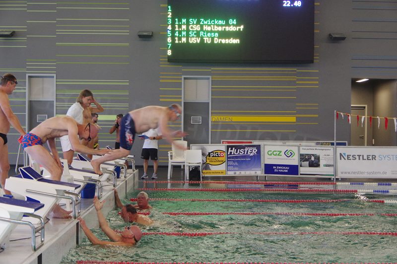 Der SV Zwickau 04 hatte am Samstag, den 04.11.23 in die "Glück Auf"-Schwimmhalle eingeladen und neben 25 weiteren Vereinen aus ganz Deutschland waren auch 11 Schwimmer unserer Chemnitzer SG Helbersdorf dieser Einladung gefolgt. Größtenteils in Fahrgemeinschaften reisten wir bis 12.00 Uhr in Zwickau an und begannen nach dem Einlass direkt mit dem Einschwimmen. Unsere kleine Mannschaft bestand aus alten erfahrenen Wettkampfhasen und ganz besonders aufgeregten Wettkampfneulingen. Wir begannen mit zwei 4x25m Freistil mixed Staffeln. Danach versuchte sich jeder über seine selbst gewählten (Lieblings)Strecken aus den 100m Lagen und allen 25m und 50m Distanzen. Nicht jeder war am Ende mit seinen Zeiten und Platzierungen zufrieden. Aber spätestens nach den 4x25m Freistil weiblich/männlich Staffeln war alle Aufregung, alle Sorgen, aller Ärger über die vermeintlich nicht erreichten Leistungen verflogen und wir machten uns alle froh und glücklich wieder auf den Heimweg.