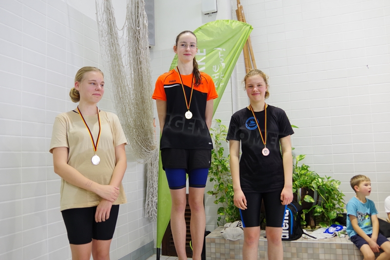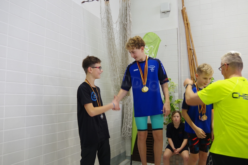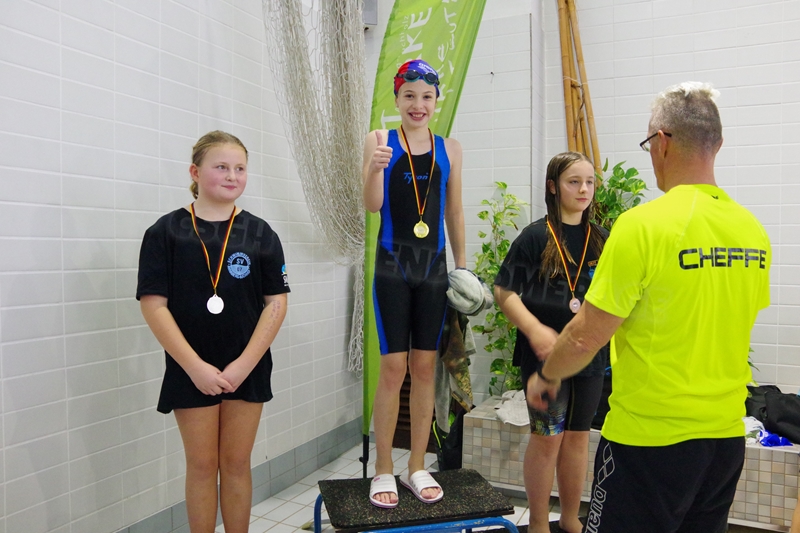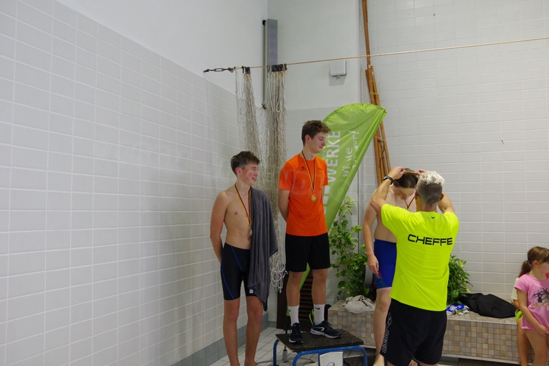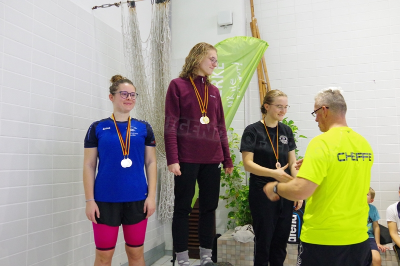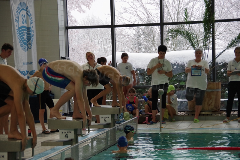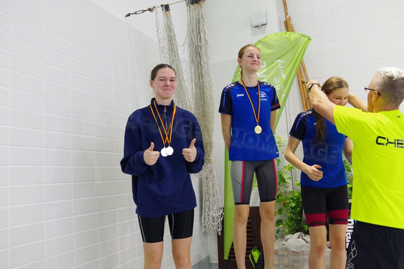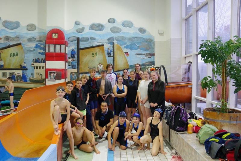 Am 02.Dezember 2023 fand wieder der traditionelle "Sprintertag" in Annaberg statt, an dem wir schon die letzten Jahre regelmäßig teilgenommen hatten. Wir (19 Schwimmer und 3 Kampfrichter) trafen uns schon 06.45 Uhr am ACC. Trotz des vielen Schnees und der winterlichen Temperaturen waren die Straßen gut befahrbar und so waren wir pünktlich zum Einschwimmen 07.45 Uhr in der Halle. 08.30 Uhr starteten die ersten Schwimmer zum Wettkampf. Geschwommen wurden heute die 50m Strecken sowie 100m Lagen. Nicht jeder konnte eine Medaille für sich erkämpfen. Aber zumindest schafften wir viele neue Bestzeiten. Wir feuerten uns gegenseitig kräftig an, fieberten bei allen mit, ob die tiefen Wenden passen und wir hatten zwischendurch viel Spaß in "unserem" kleinen Rutschenauslaufbecken. So war es für alle Teilnehmer eine sehr schöne entspannte Atmosphäre. Unsere drei Kampfrichter waren ebenso fleißig als Zeitnehmer (Julian und Heiko) bzw. im Zielgericht (Katja) im Einsatz. Nach erfolgreichem Wettkampf gab es für alle noch leckere Schoko-Weihnachtsmänner, die wir von unserem lieben