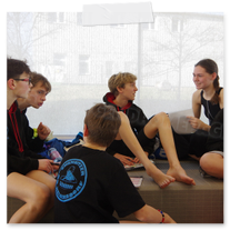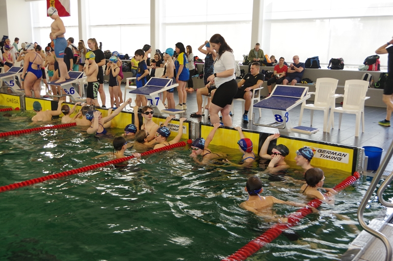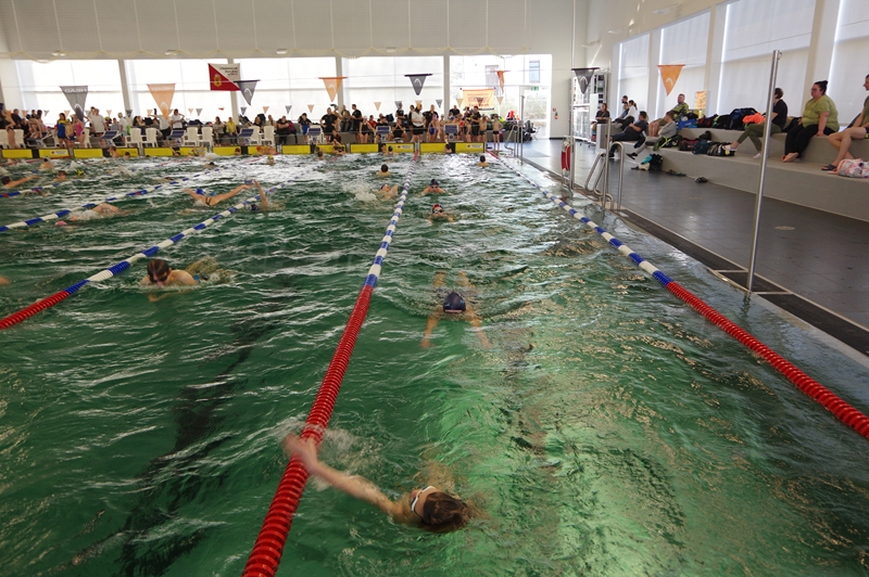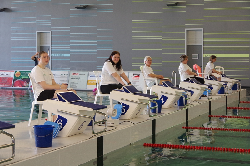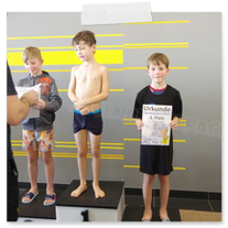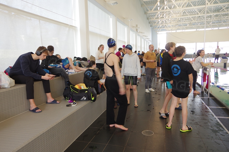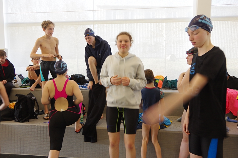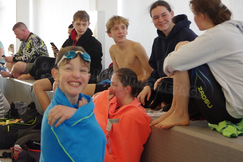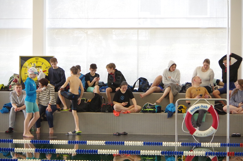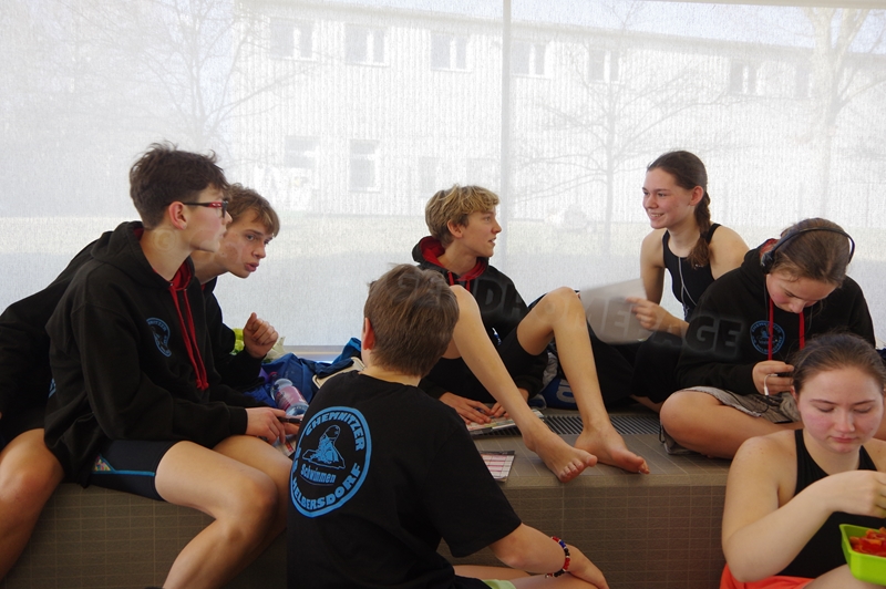 9.00 Uhr begann das Einschwimmen. Trotz der acht 25m-Bahnen war das Becken schnell sehr voll und so kürzten wir unser Einschwimmen etwas ab. Pünktlich 09.30 Uhr gab es auch schon den ersten Start. Da wir nur mit den Großen angereist waren, standen für unsere Mannschaft nur die 50er Strecken und 100m Lagen auf dem Plan. Mit uns waren „nur“ 7 Vereine am Start, dafür war das Niveau der Teilnehmer sehr hoch. So stand für uns heute vor allem das Erreichen bzw. Verbessern der Meldezeiten im Fokus. Wir verglichen eifrig die Zeiten der Anzeigetafel mit den Zeiten im Meldeergebnis und konnten für alle Teilnehmer in fast allen Strecken eine Verbesserung sehen. Auch wenn sich das leider nicht im Erreichen der vorderen Platzierungen widerspiegelte, war der Wettkampf doch für alle ein großer Erfolg. Zwischen den Starts gab es auch ein wenig Zeit für Spiele („Stadt, Land, Vollpfosten“) oder zum Quatschen. 14.00 Uhr machten wir uns bei schönstem Wetter wieder auf die Heimfahrt und erreichten 14.45 Uhr das ACC.