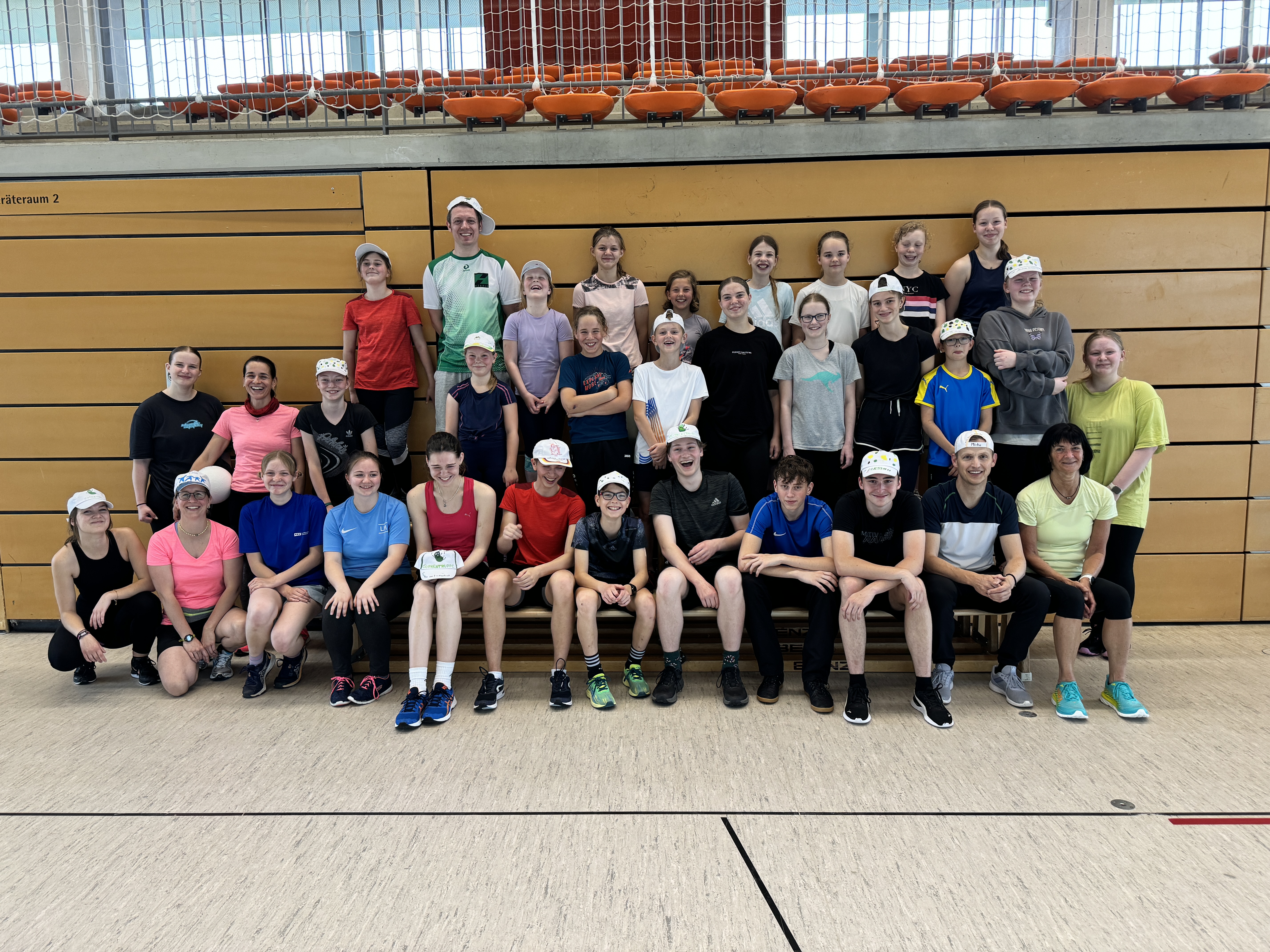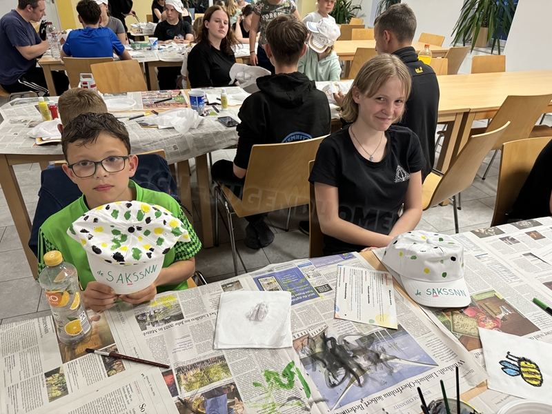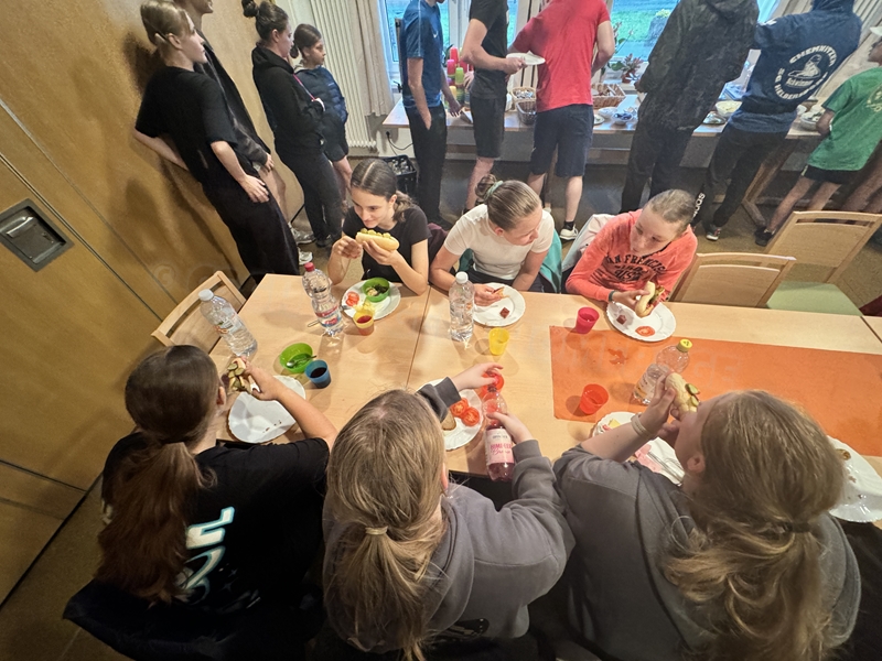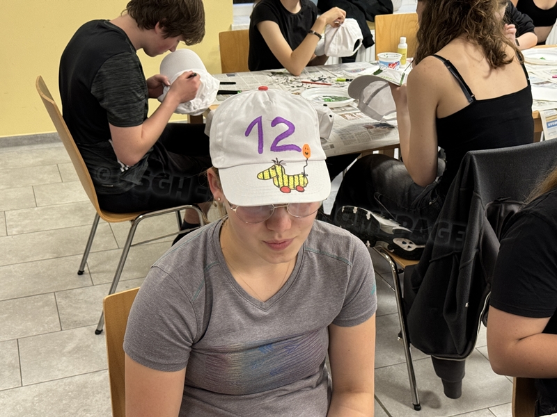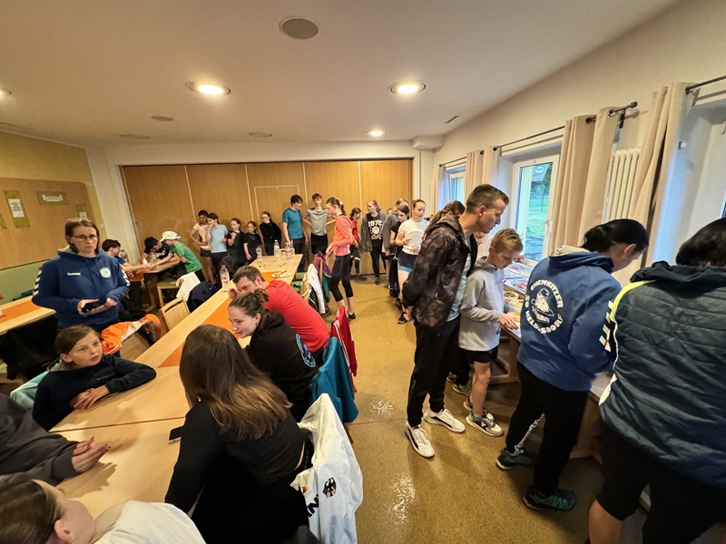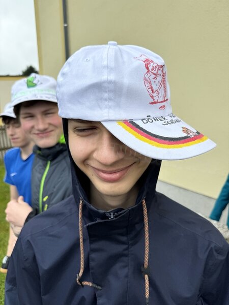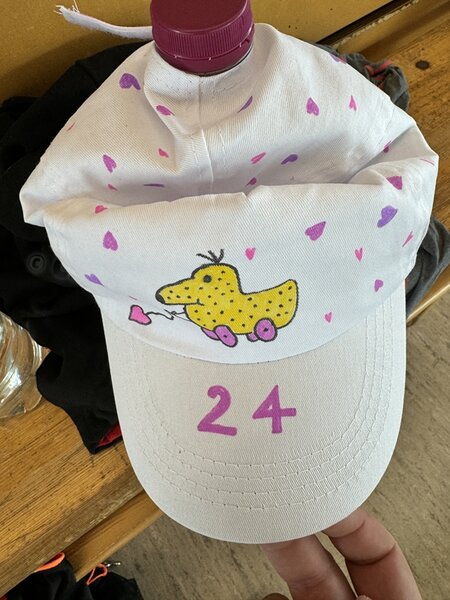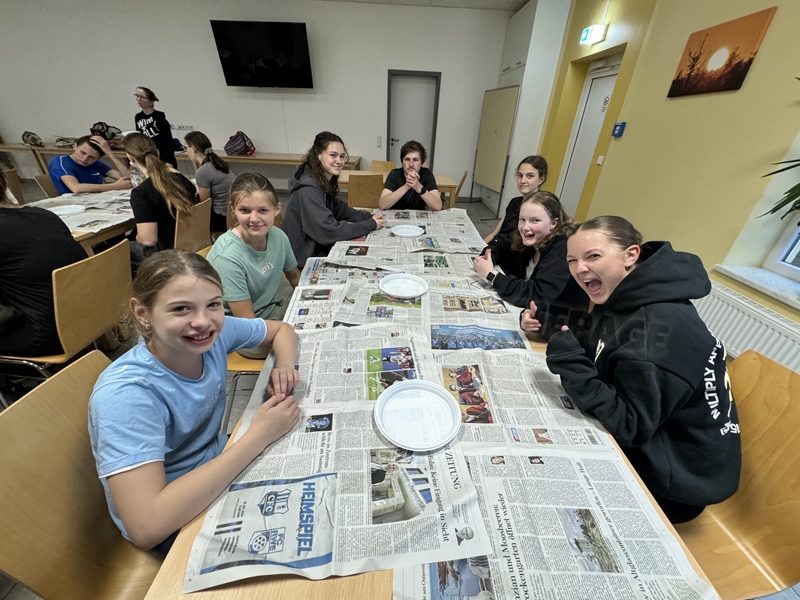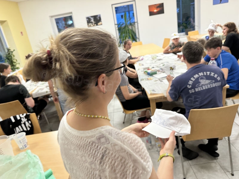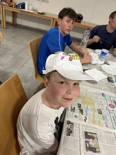 Zum 33. Trainingslager in Flöha trafen wir uns mit 34 Schwimmern vom 31.05.-02.06.24. Die Planung für dieses SOMMER-Trainingslager sah wie immer viele sportliche Aktivitäten im Freien und unseren traditionellen Freibadbesuch vor. Doch am Mittwoch vergangene Woche mussten wir noch einmal alles umplanen, denn der Wetterbericht sagte für uns dieses Wochenende Unmengen von Regen und Schlimmeres voraus. (Hier die Bilder aus dem Förderverein von 2013). Am Freitag war zwischen 16.30 und 17.30 Uhr Anreise und Zimmer beziehen. Die erste Herausforderung bestand hierbei im Beziehen der Betten. Es war für uns sehr schnell klar, wer das noch nie zu Hause selbst gemacht hatte und wir amüsierten uns köstlich über die Versuche Einiger, den Bettbezug über die Bettdecke zu ziehen. Nach dem Abendessen 18.30 Uhr stand uns keine Turnhalle zur Verfügung (da parallel zu uns mehrere Abschlussfeiern stattfanden und wir im Vorfeld nichts gemietet hatten, weil wir ja mit schönem Wetter gerechnet hatten). So nutzten wir das kleine Volleyballfeld im Auenstadion für ein paar Ballspiele. Als aber der Regen zu stark wurde, zogen wir uns in den Aufenthaltsraum zurück und teilten die Gruppe in die 4 Teams ein, die am Samstag jeweils unsere Hockeystaffeln und das Turnier zusammenspielen. Jeder bekam ein weißes Basecap und Stoffmalfarben. Die Teams sollten sich einen Teamnamen überlegen und passend dazu die Basecaps gestalten. Während manche mit dieser Aufgabe zunächst etwas überfordert waren, begannen andere sehr eifrig und mit viel Liebe die Caps zu bemalen. Gegen 21 Uhr hatten es alle geschafft und wir gingen in unsere Zimmer und irgendwann auch ins Bett.