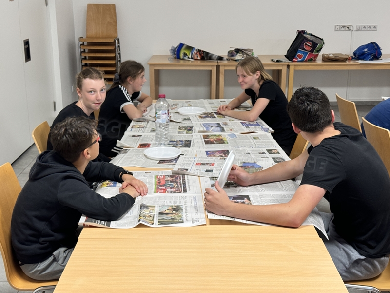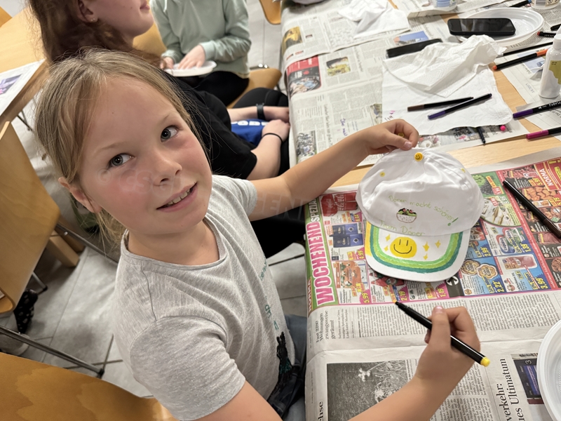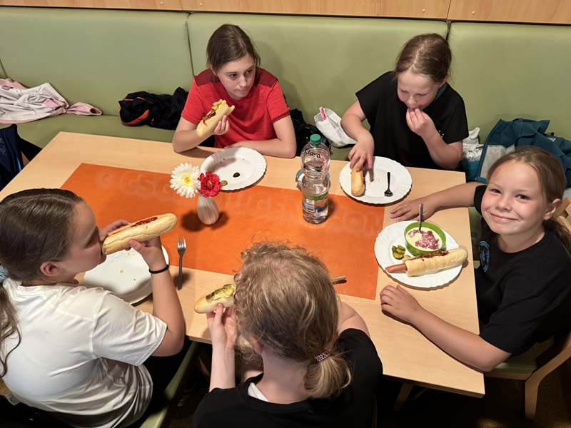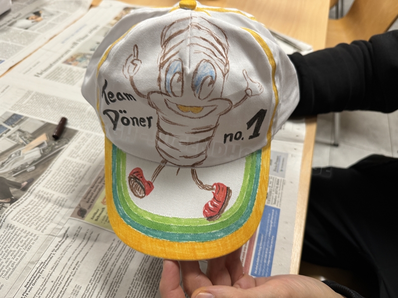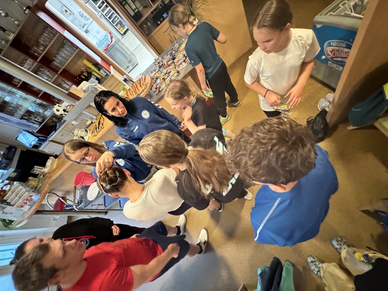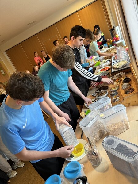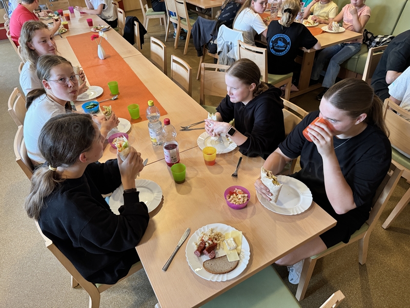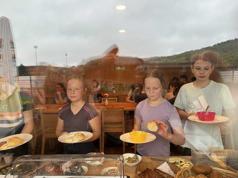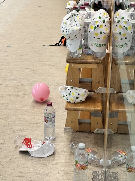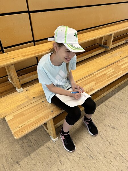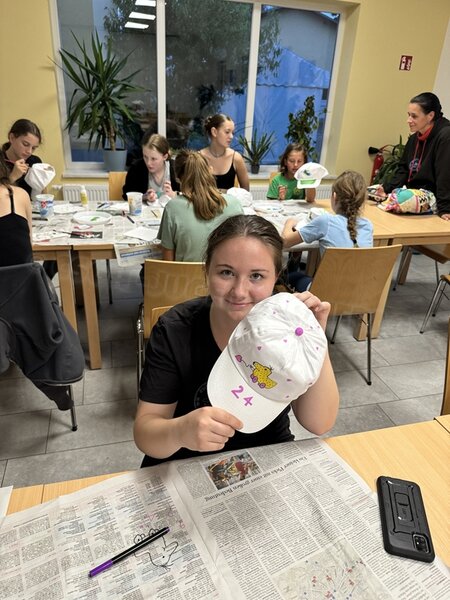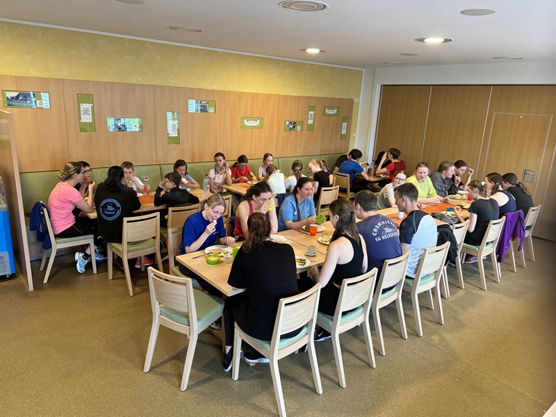 Zum 33. Trainingslager in Flöha trafen wir uns mit 34 Schwimmern vom 31.05.-02.06.24. Die Planung für dieses SOMMER-Trainingslager sah wie immer viele sportliche Aktivitäten im Freien und unseren traditionellen Freibadbesuch vor. Doch am Mittwoch vergangene Woche mussten wir noch einmal alles umplanen, denn der Wetterbericht sagte für uns dieses Wochenende Unmengen von Regen und Schlimmeres voraus. (Hier die Bilder aus dem Förderverein von 2013). Am Freitag war zwischen 16.30 und 17.30 Uhr Anreise und Zimmer beziehen. Die erste Herausforderung bestand hierbei im Beziehen der Betten. Es war für uns sehr schnell klar, wer das noch nie zu Hause selbst gemacht hatte und wir amüsierten uns köstlich über die Versuche Einiger, den Bettbezug über die Bettdecke zu ziehen. Nach dem Abendessen 18.30 Uhr stand uns keine Turnhalle zur Verfügung (da parallel zu uns mehrere Abschlussfeiern stattfanden und wir im Vorfeld nichts gemietet hatten, weil wir ja mit schönem Wetter gerechnet hatten). So nutzten wir das kleine Volleyballfeld im Auenstadion für ein paar Ballspiele. Als aber der Regen zu stark wurde, zogen wir uns in den Aufenthaltsraum zurück und teilten die Gruppe in die 4 Teams ein, die am Samstag jeweils unsere Hockeystaffeln und das Turnier zusammenspielen. Jeder bekam ein weißes Basecap und Stoffmalfarben. Die Teams sollten sich einen Teamnamen überlegen und passend dazu die Basecaps gestalten. Während manche mit dieser Aufgabe zunächst etwas überfordert waren, begannen andere sehr eifrig und mit viel Liebe die Caps zu bemalen. Gegen 21 Uhr hatten es alle geschafft und wir gingen in unsere Zimmer und irgendwann auch ins Bett.