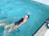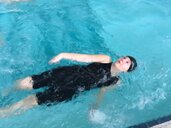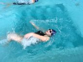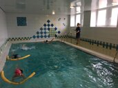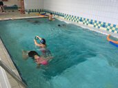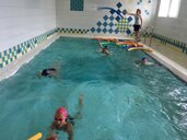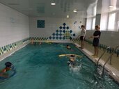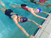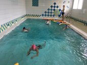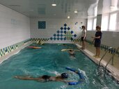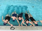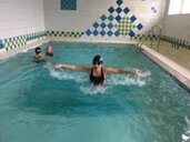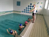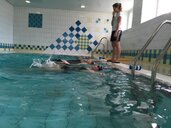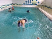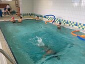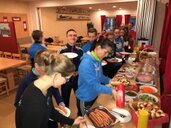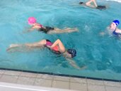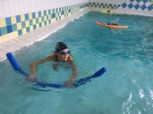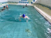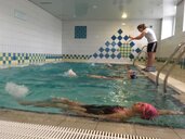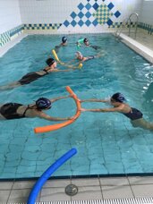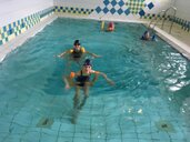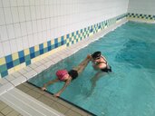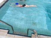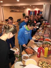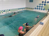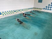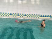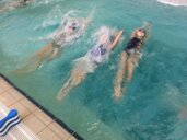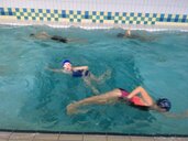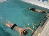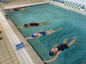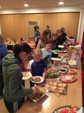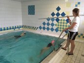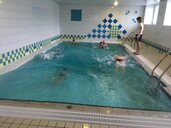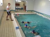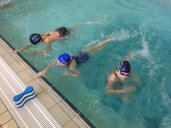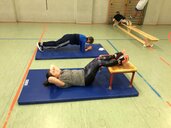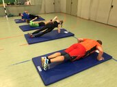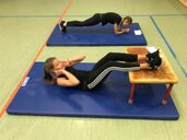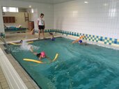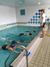 7.45 Uhr gab es erstmal Frühstück. Danach gingen die Kleinsten von uns mit Betty und Anne in die Schwimmhalle. Dort übten sie fleißig 2 Stunden Beinarbeit sowie Kraul- und Delfintechnik. Und natürlich kam der Spaß beim Tauchen und Staffeln nicht zu kurz. Für die Großen stand ein intensiver Kraftkreis bestehend aus jeweils 10 Übungen für Arme/Rumpf und Beine auf dem Plan. In insgesamt 6 Durchgängen gab jeder alles. Nach 2 Stunden waren wir total platt. Alle gemeinsam freuten sich auf die leckeren Spirelli mit Wurst, Tomso und Käse. Bis 14 Uhr war Mittagspause. Manche erledigten Hausaufgaben. Wer nix zu tun hatte, schaute sich mit Betty und Anne kurze Filme über Schwimmtechnik an.