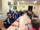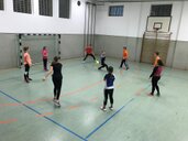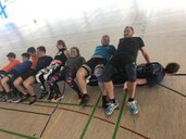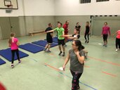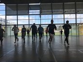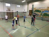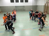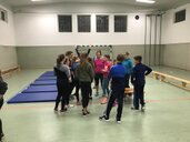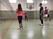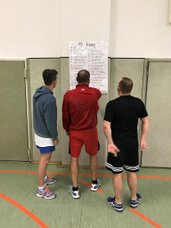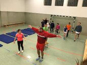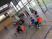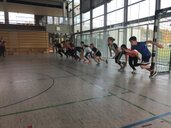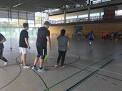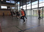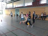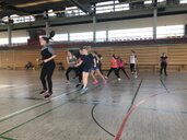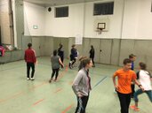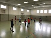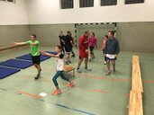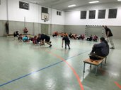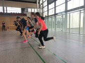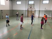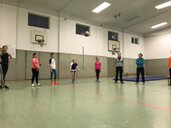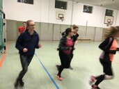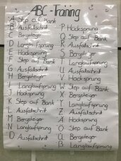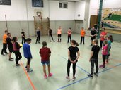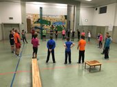 Am Samstag klingelte der Wecker 6.30 Uhr. 7.00 Uhr standen alle munter und fröhlich in der Turnhalle zum Frühsport. Entsprechend der Vorgabe auf dem "ABC-Training" erfüllte jeder die Übungen, die die Buchstaben seines Vor- und Nachnamens zeigten. Gut erwärmt und richtig wach, machten wir unser klassisches Kennenlernspiel. (Am Freitag Abend waren noch nicht alle da.)