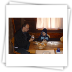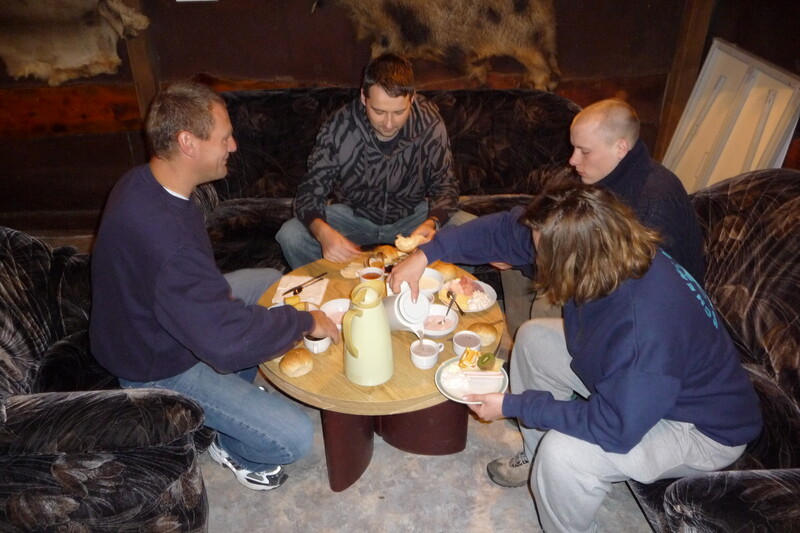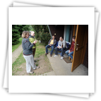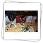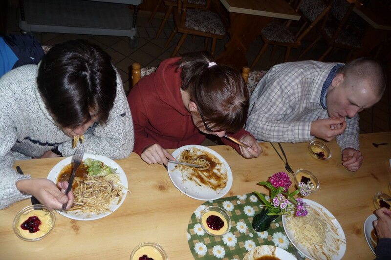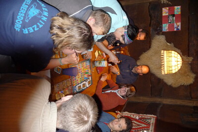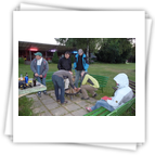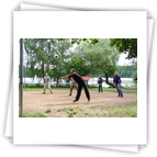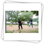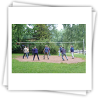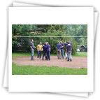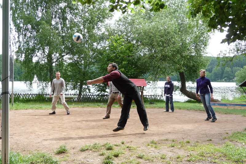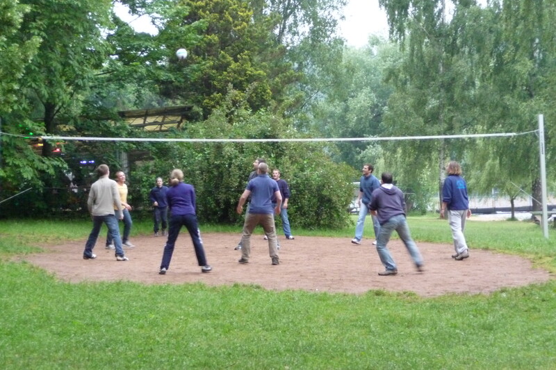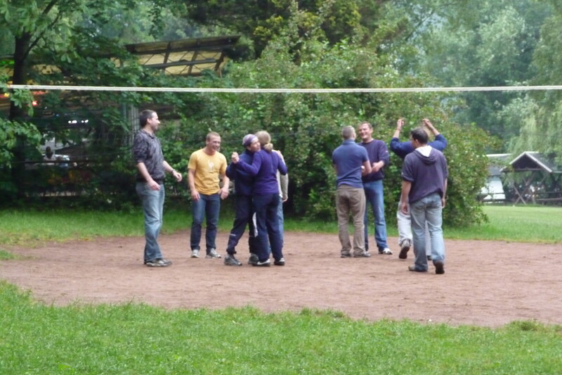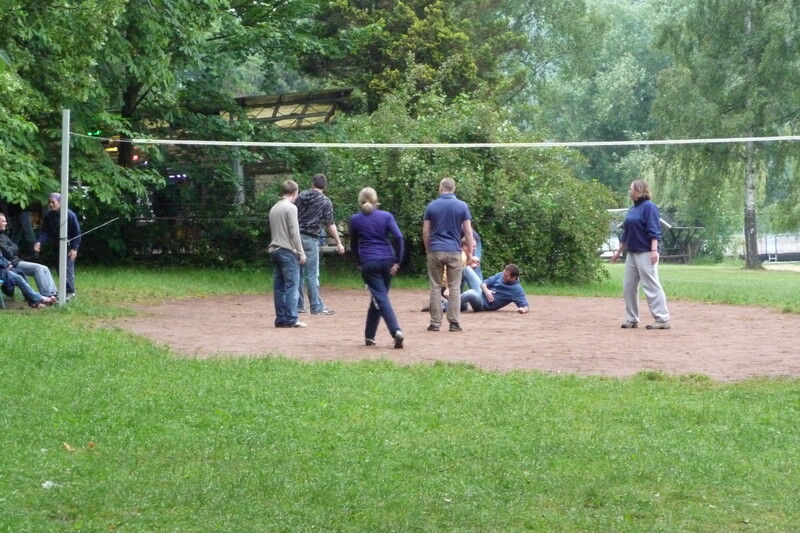 14.00 Uhr brachte uns die "MS Höfchen" wieder ans andere Ufer und wir spazierten zurück zur JH, wo Mario & Co schon den Grill angeworfen hatten. Völlig ausgehungert verschlangen wir in der "Baude" Steaks, Roster und Nudelsalat und ruhten uns erstmal aus, denn zu diesem Zeitpunkt schüttete es, was nur ging. Und dann gab es auch schon Abendbrot (Kartoffelbrei mit Krautrouladen). Danach schien schon wieder die Sonne und wir begannen ein zweistündiges Volleyballspiel : "Team Frank" gegen "Team Frank" - zwei so ausgeglichene Mannschaften, dass es spannender nicht hätte sein können. Besonders unser "Italian Man" Davide trug zur heiteren Stimmung bei und so hatten wir auch eine ordentliche Portion Lachmuskeltraining dabei. Am Ende gewann - wie sollte es anders sein - mit 3:2 nach Sätzen das "Team Frank". Die Uhr zeigte 21.30 Uhr und so zogen wir uns in die "Baude" zurück und spielten bis kurz vor 0.00 Uhr "Activity", was nicht minder lustig ausfiel. Danach verschwanden alle mehr oder weniger schnell in ihren Betten.