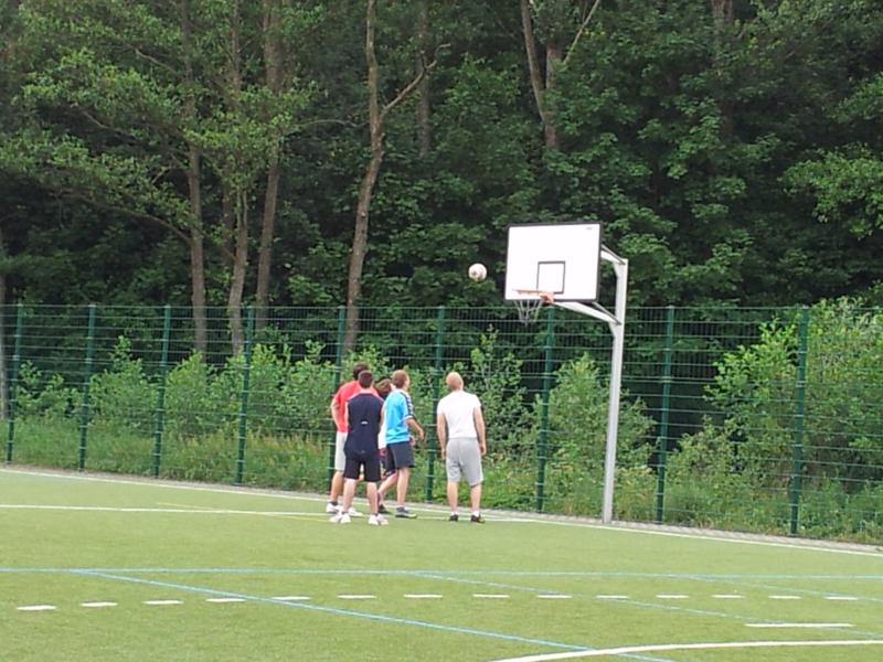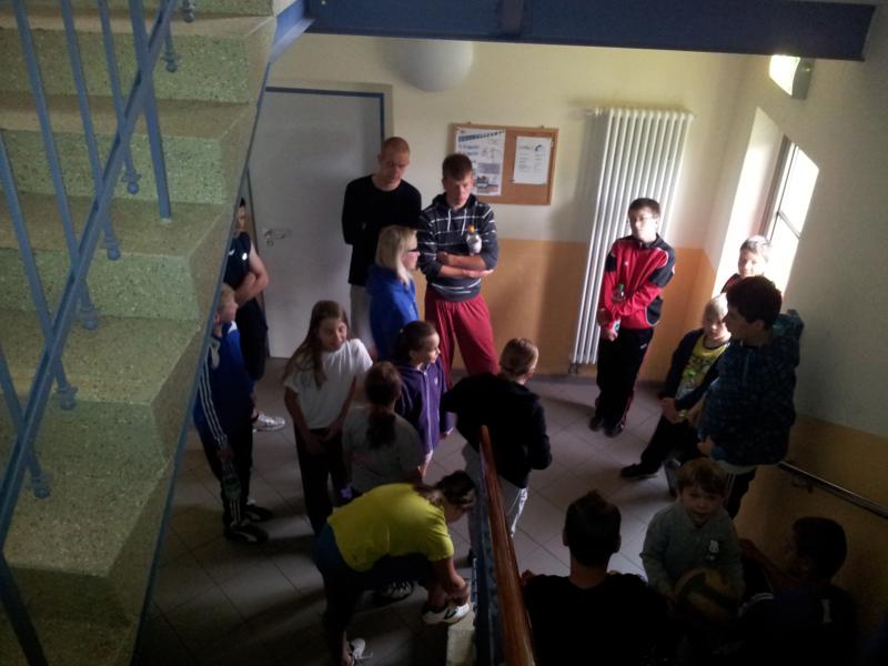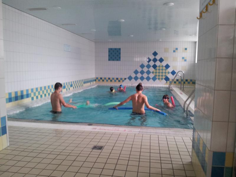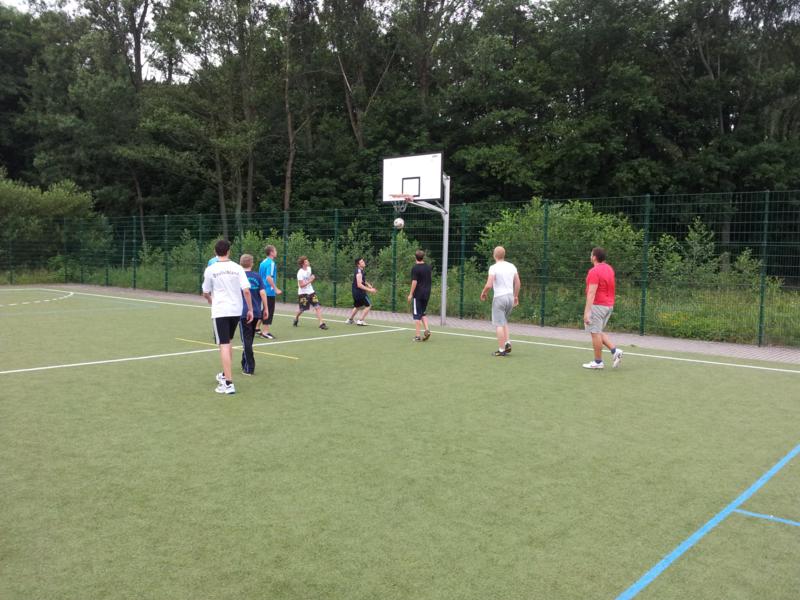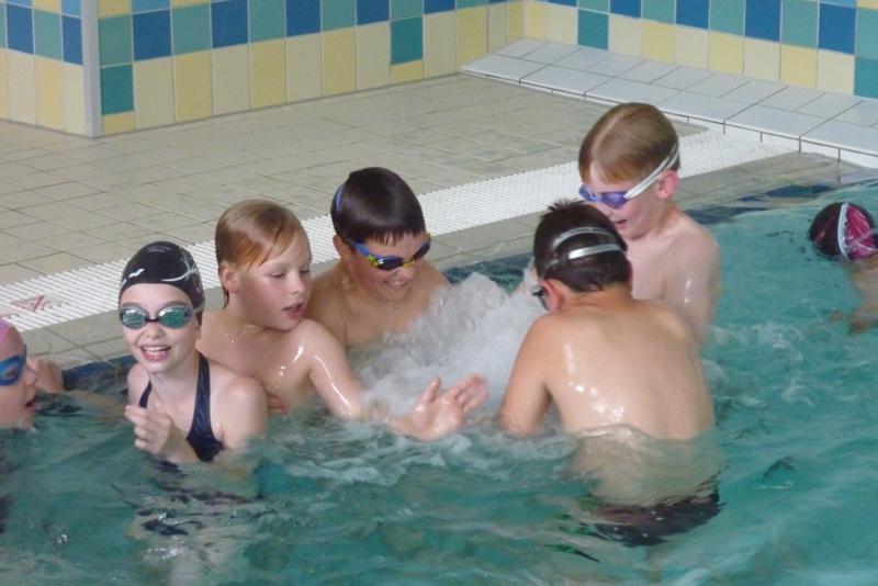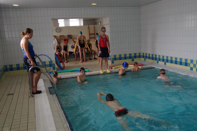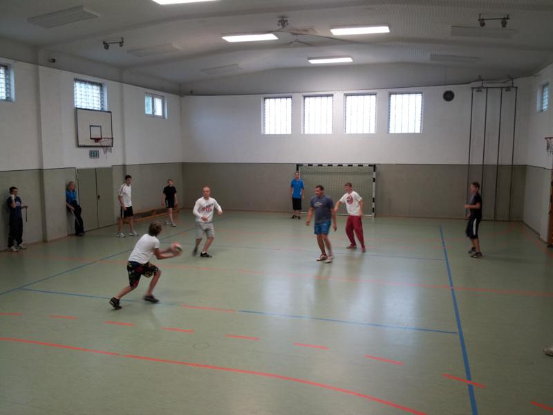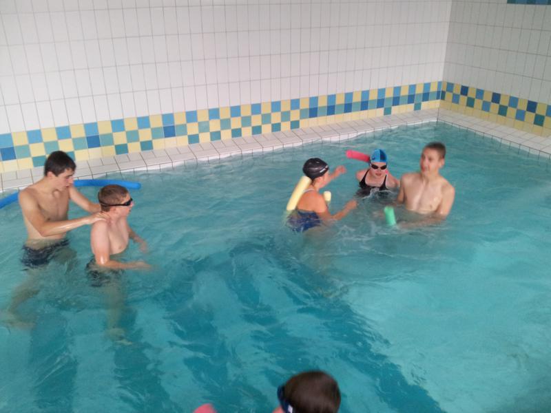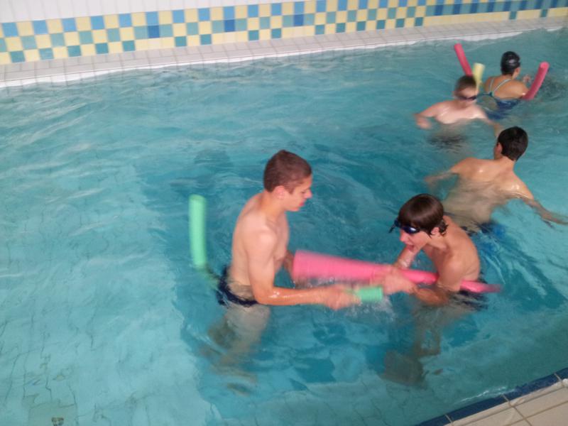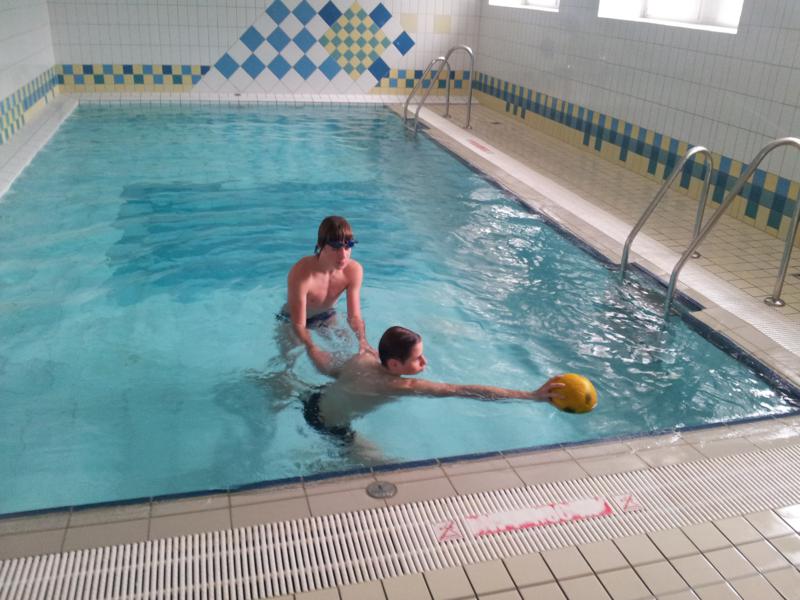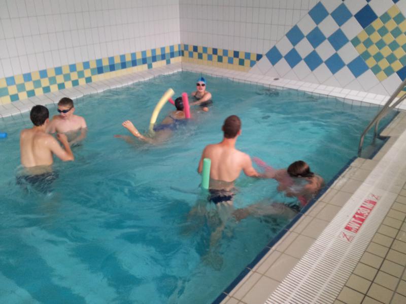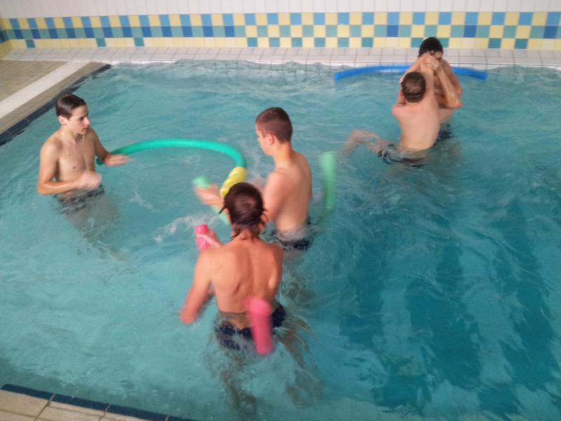 Der Samstag begann zeitig mit Frühsport im Freien. Wir rannten 15 min, machten ein kleines Lauf - ABC und spielten Ball über die Schnur. Dann gab es Frühstück. Danach teilten wir uns auf: Betty, Anne und Ellen zogen mit den Kleinen in die Schwimmhalle los, Patrick spielte mit den Großen Fuß- und Basketball. Alle bewegten sich und schwitzen mächtig, sodass wir uns sehr freuten, als es endlich Nudeln mit Käse und Tomatensoße zum Mittag gab. Nach dem Essen hatten die Großen eine kleine Pause, während Betty und Anne schon wieder Richtung Schwimmhalle unterwegs waren und dort mit den Kindern nochmal das Gelernte vom Vormittag wiederholten. 15.00 Uhr wurde gewechselt: Patricks Große trainierten 2 h im Wasser, wobei neben Befreiungsgriffen aus dem Rettungsschwimmerbereich und Wasserballtips von Max auch bunte Nudeln und die Sprudeldüsen zum Einsatz kamen :o), während die Kleinen sich beim entspannten Minigolf und auf den Zimmern erholten. Nach dem abendlichen Grillen gab es noch ein spannendes 2 Felderball-Turnier: 2 Mannschaften von den Kleinen spielten gegeneinander um den Sieg und 2 Mannschaften von den Großen. Alle spielten sehr fair und am Ende gab es Preise für jeden. Leider endete dieser Abend mit einem traurigen Zwischenfall: 2 min vor Ende des letzten Spiels knickte Tabea H. um und der Außenknöchel tat so weh, dass wir den Notarzt rufen mussten. (Glücklicherweise stellte sich nach dem Röntgen im Krankenhaus raus, dass nichts gebrochen ist. Aber die arme Tabea war natürlich trotzdem mächtig traurig, dass das schöne Wochenende so abrupt beendet war. WIR WÜNSCHEN DIR GUTE BESSERUNG !!!) Während die Großen nach dem Schreck doch noch eine Runde Volleyball spielten, gingen die Kleinen auf ihre Zimmer und fielen sehr schnell sehr erschöpft ins Bett.